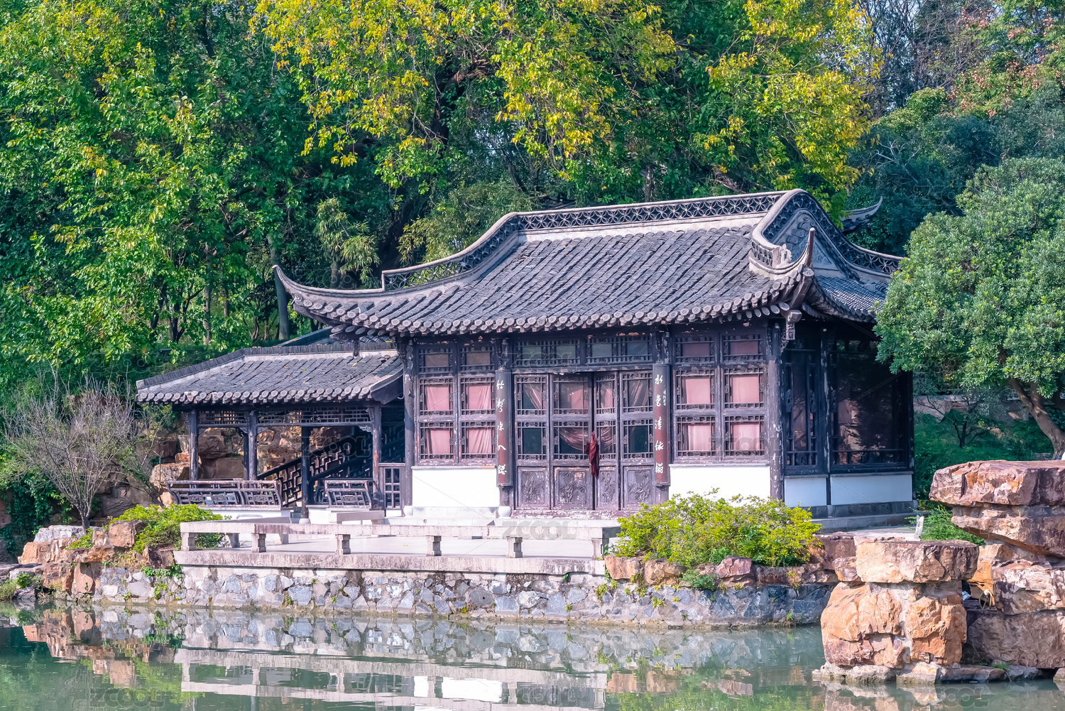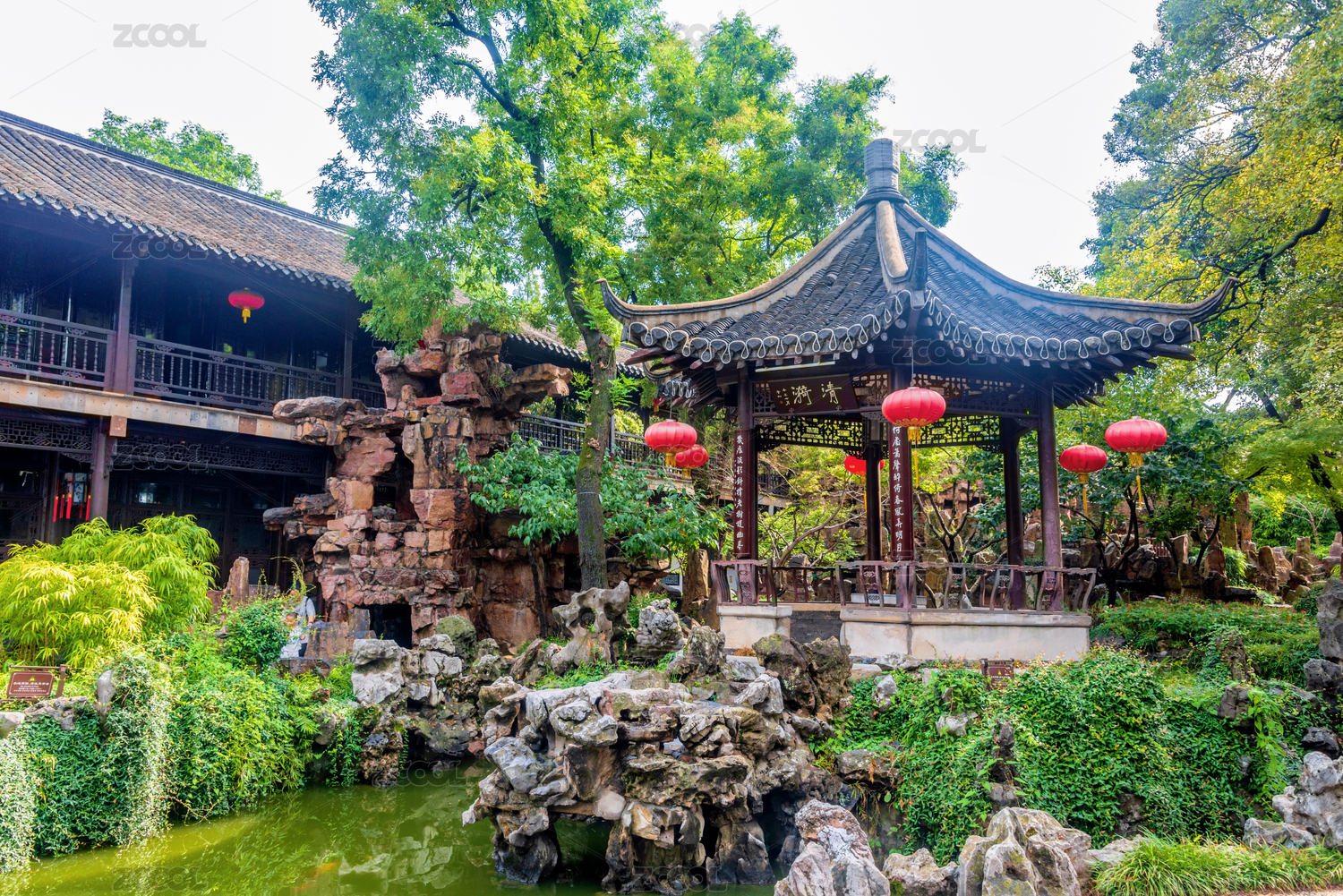 苏州园林内雨天景色