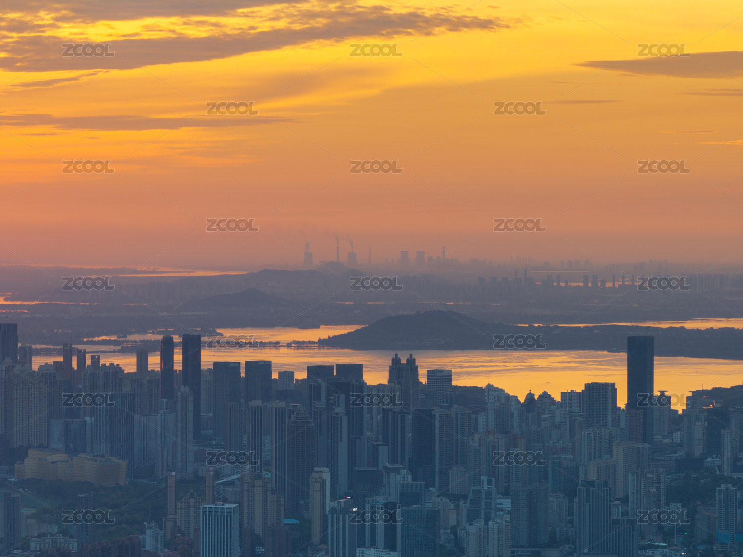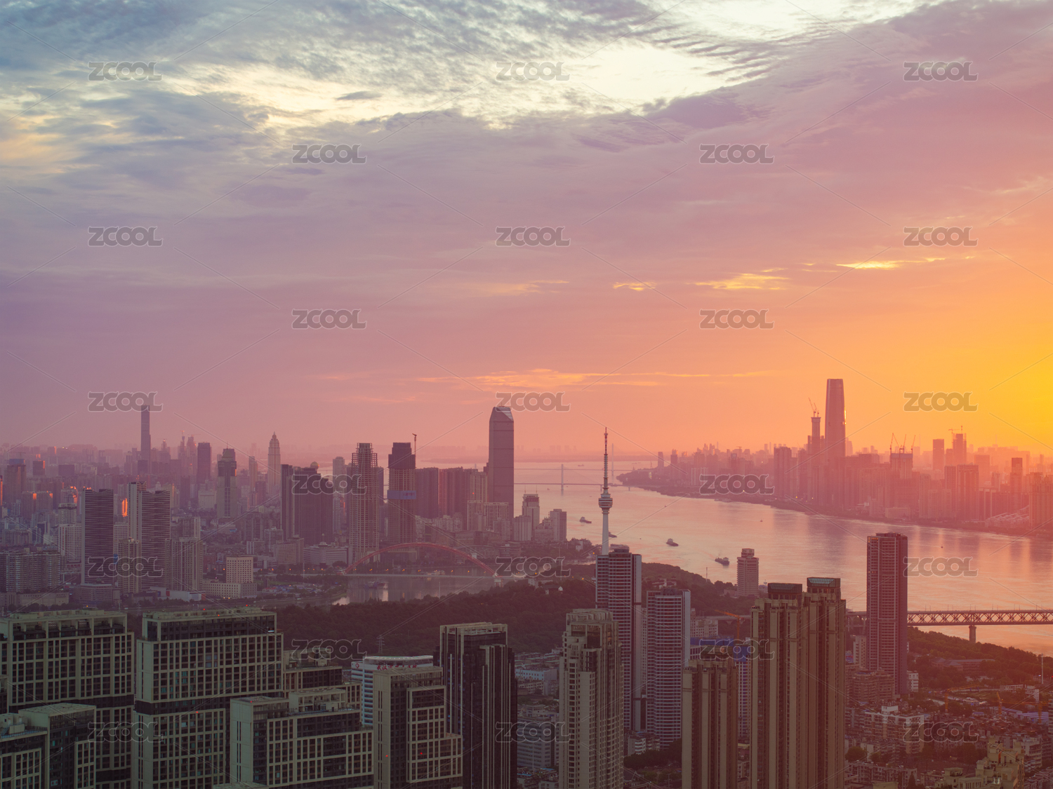 武汉夏日城市地标天际线日出风光