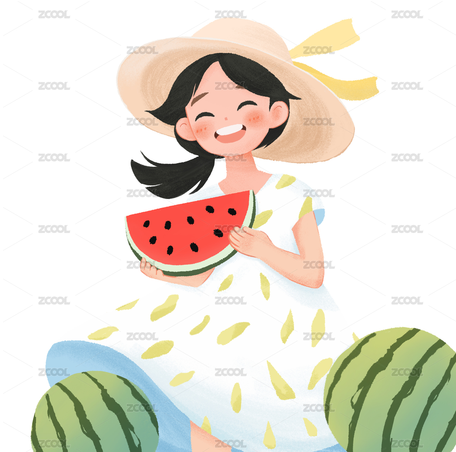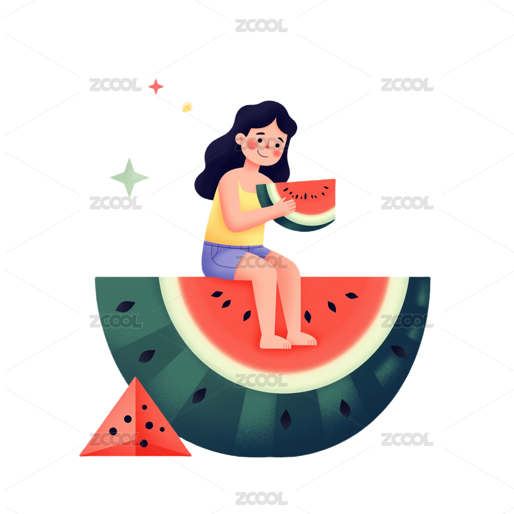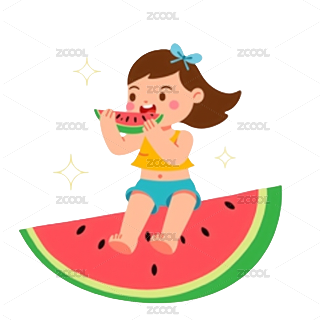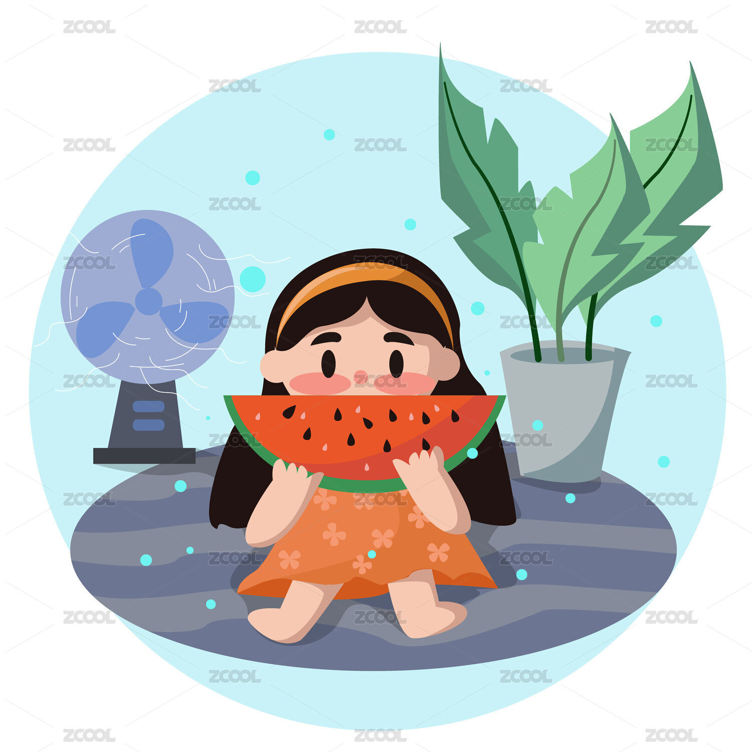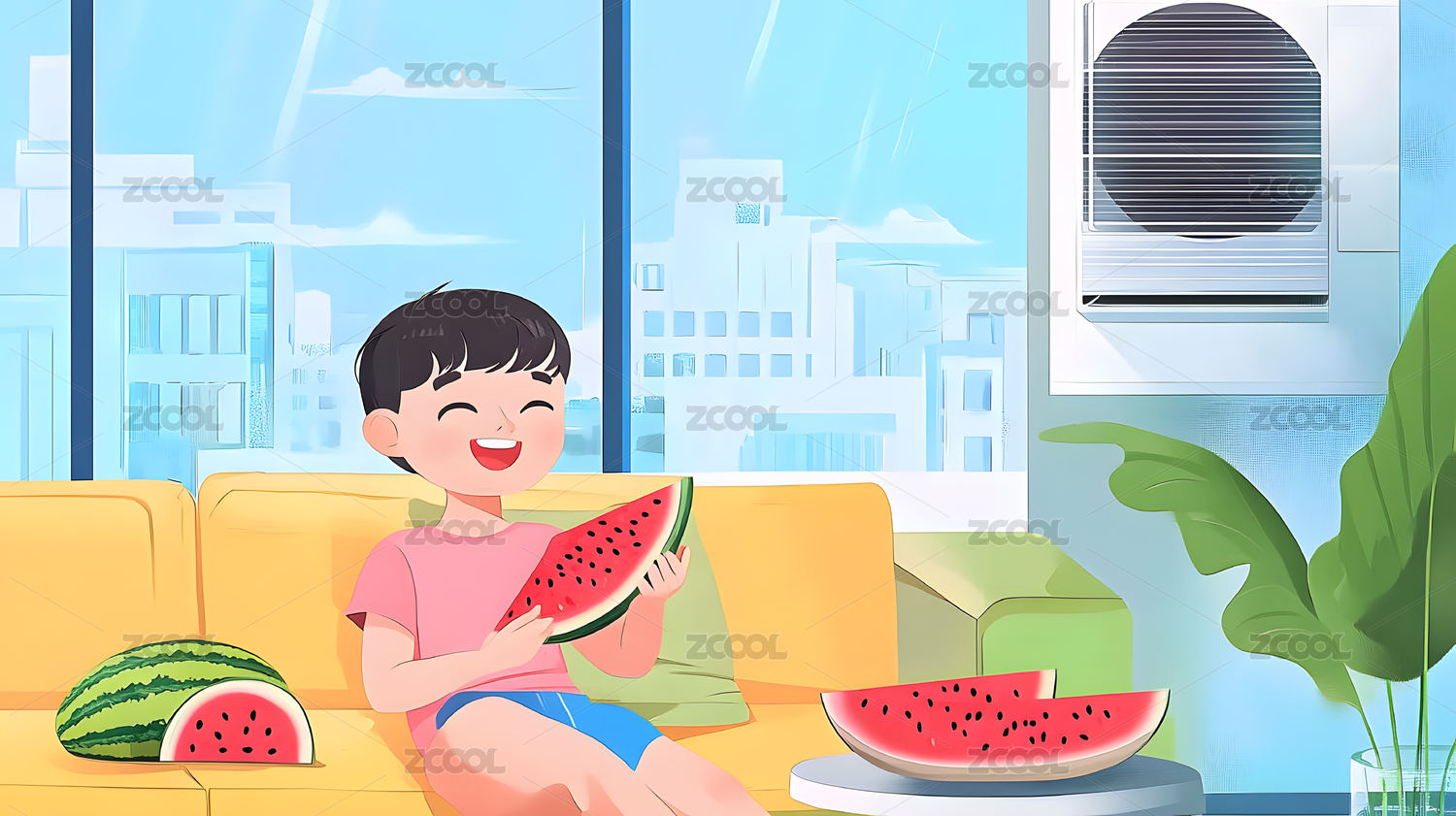 夏天空调房间吃西瓜的儿童孩子卡通插画