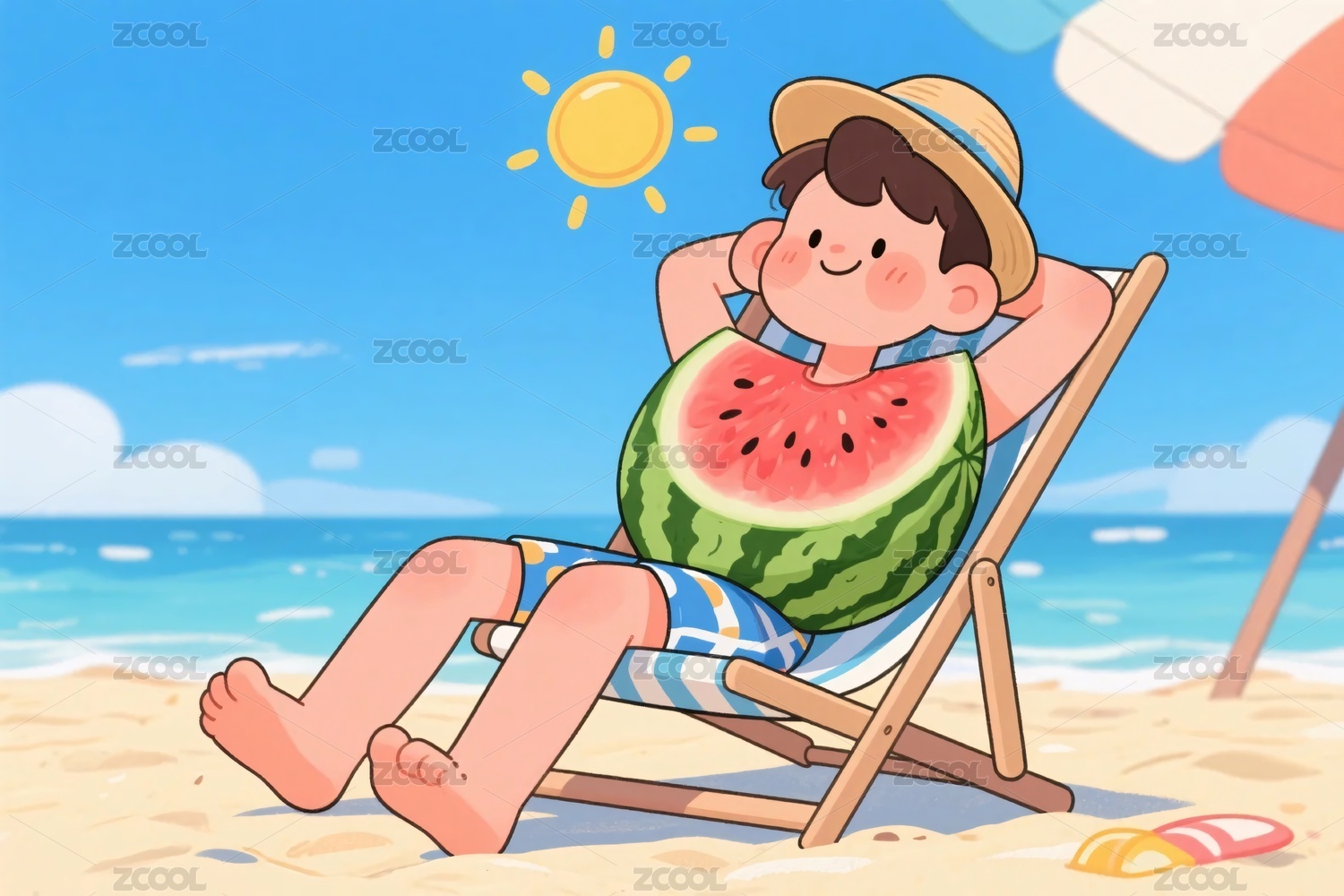 夏天躺椅上扇扇子纳凉吃西瓜的小孩