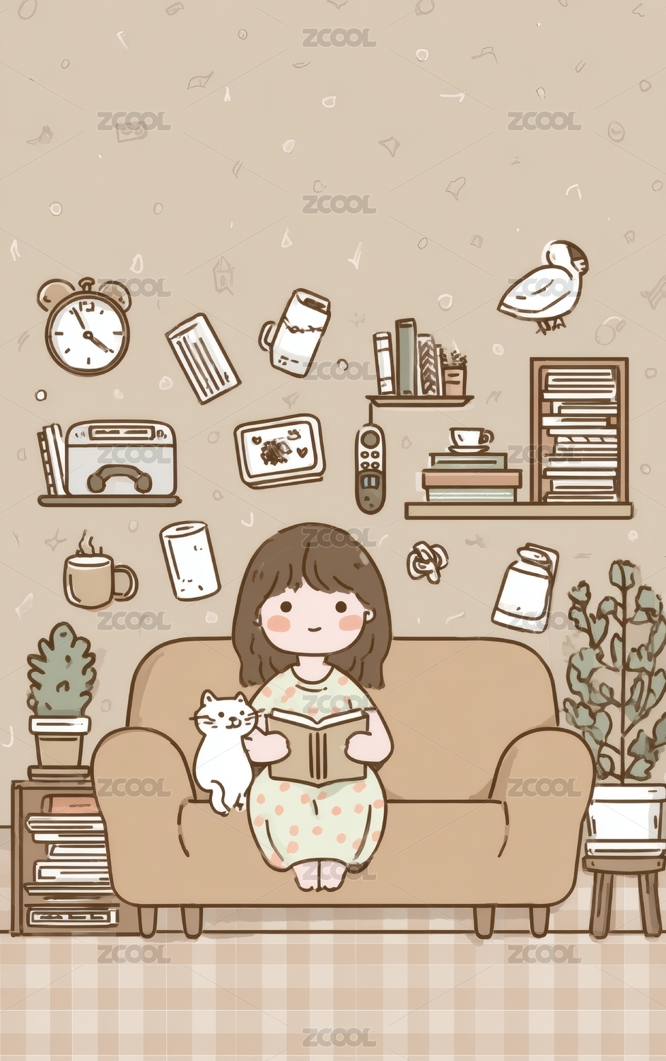 女孩沙发看书温馨日系插画