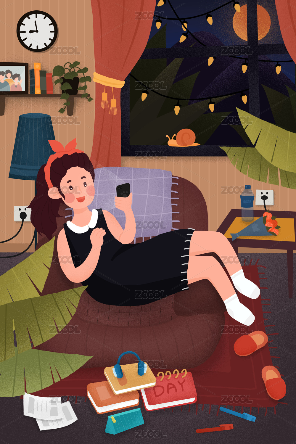 小清新手绘室内场景客厅沙发玩手机女孩插画