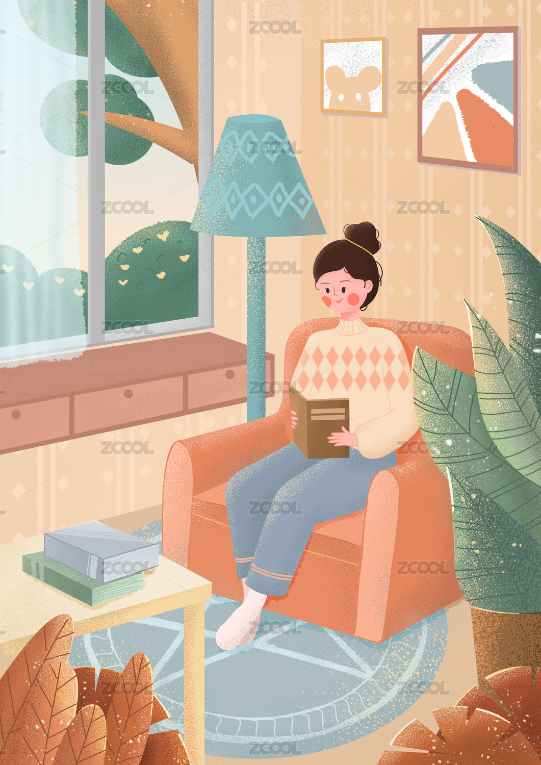 家居插画-看书的女孩