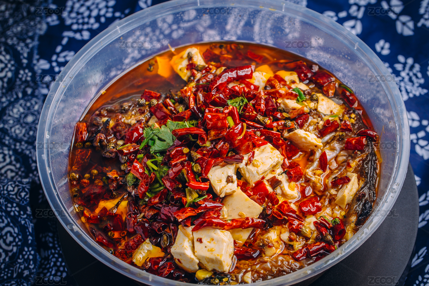 青花瓷盆装的香辣川味水煮鱼