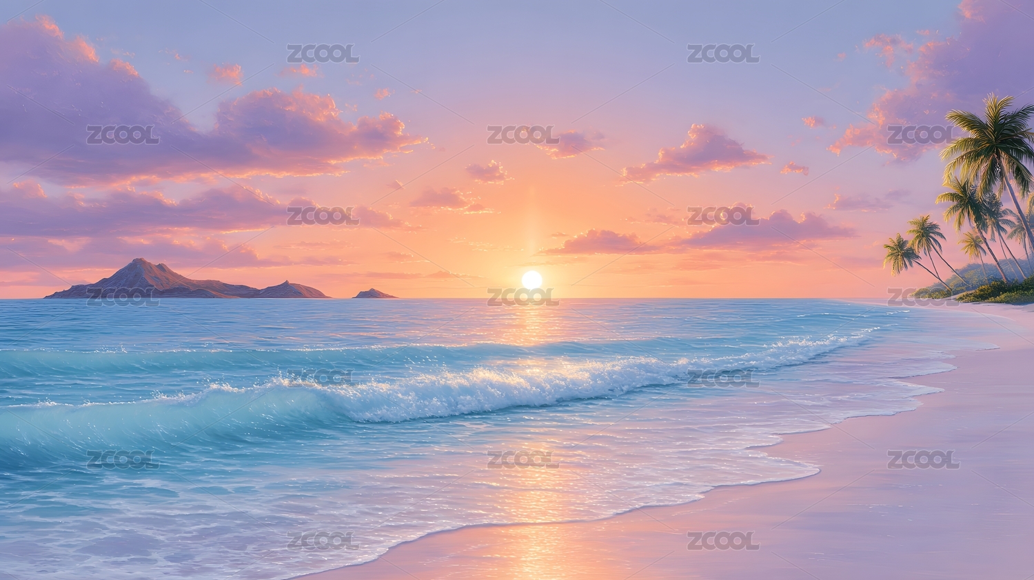 日落椰林海浪