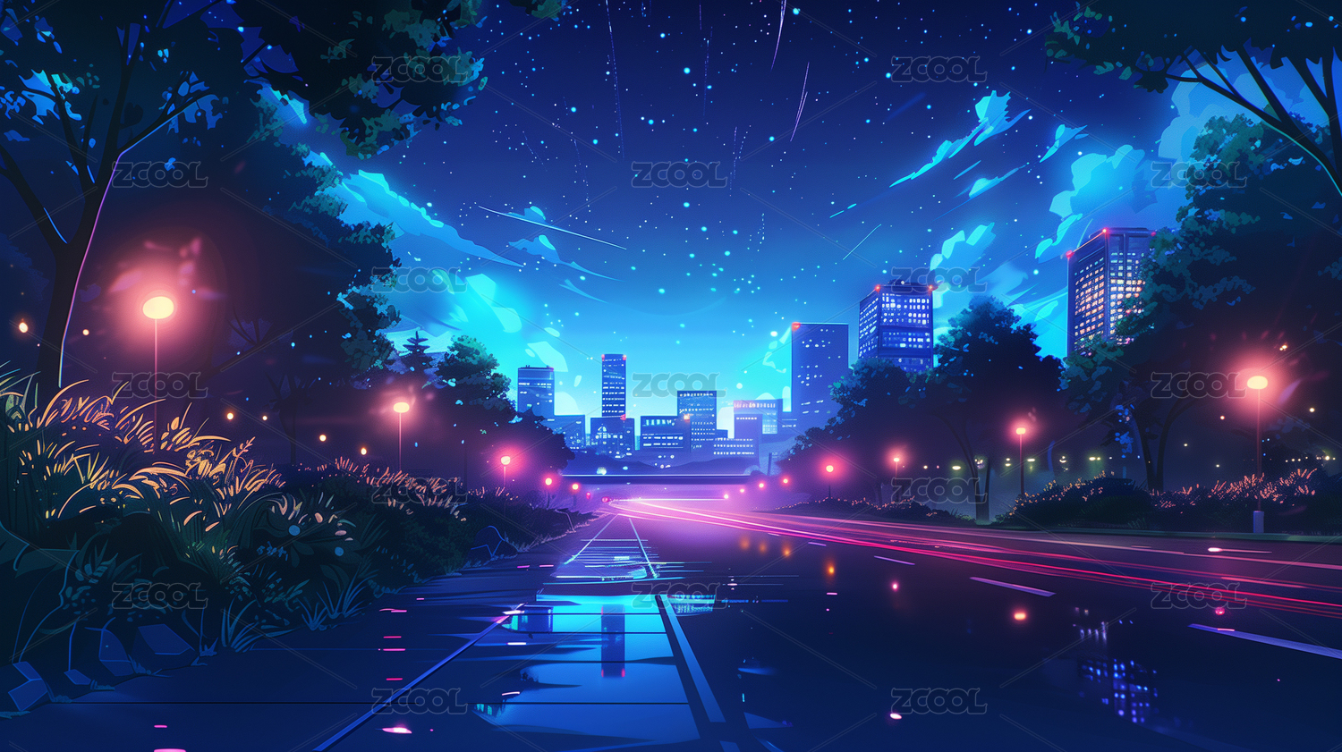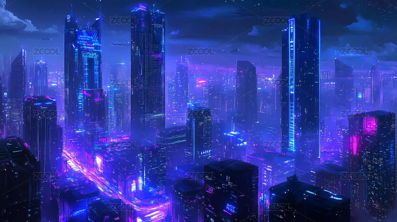 夜晚,灯光,辉映,未来,城市,街景,建筑,摩天楼,粉色,蓝色