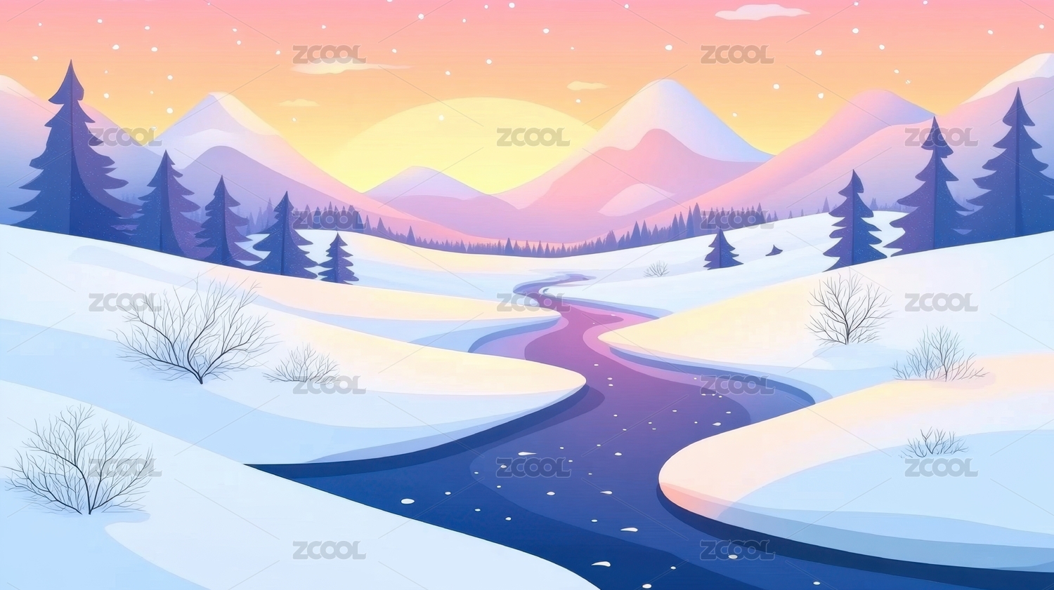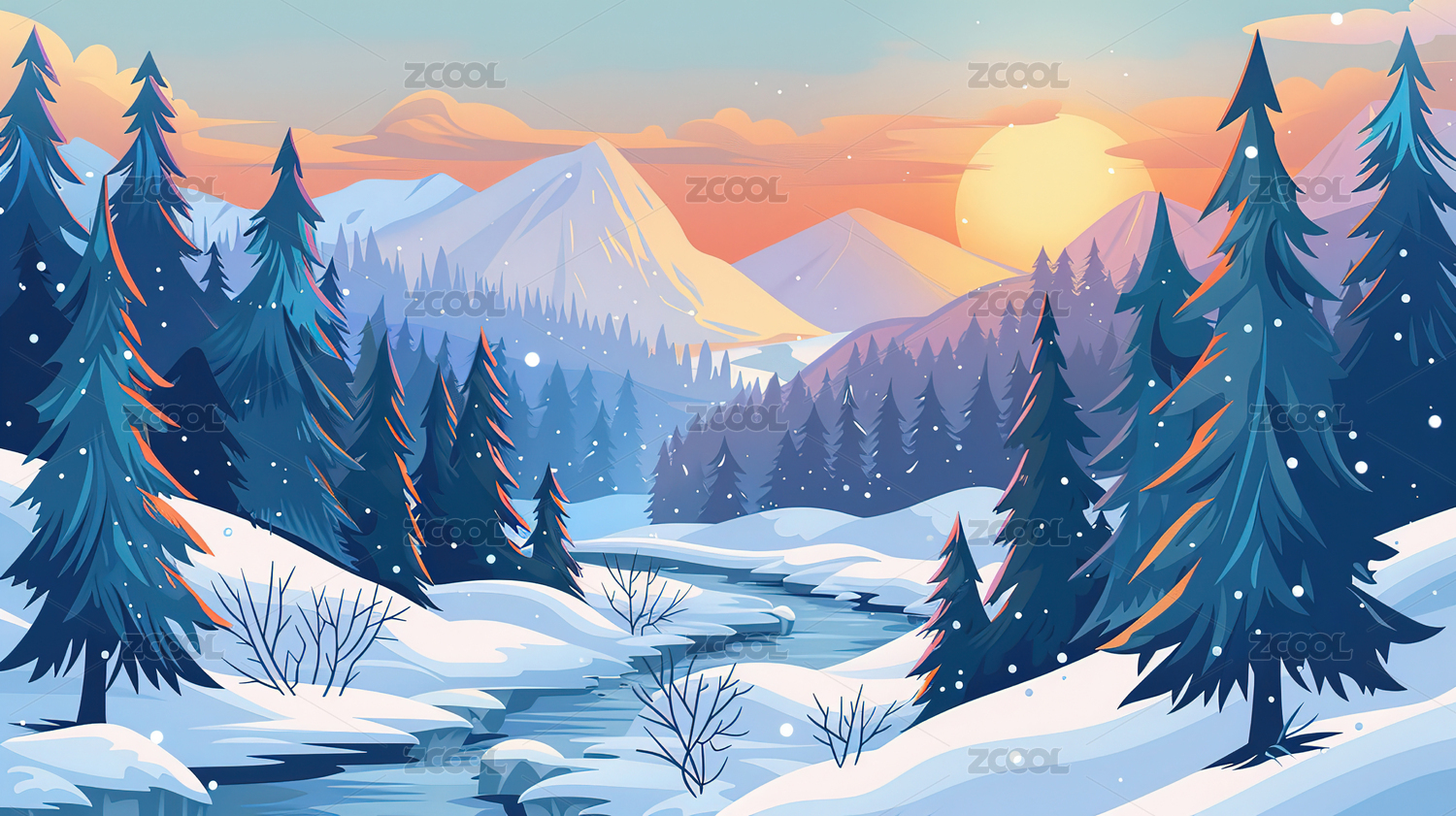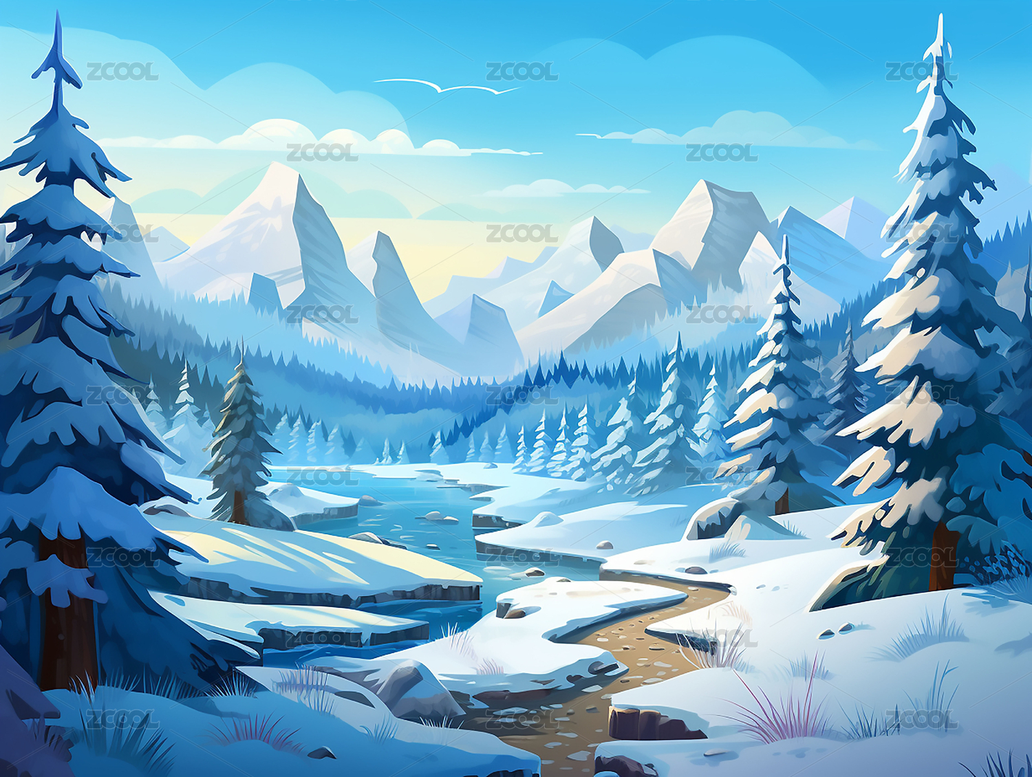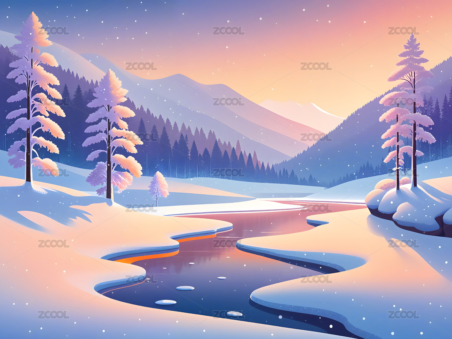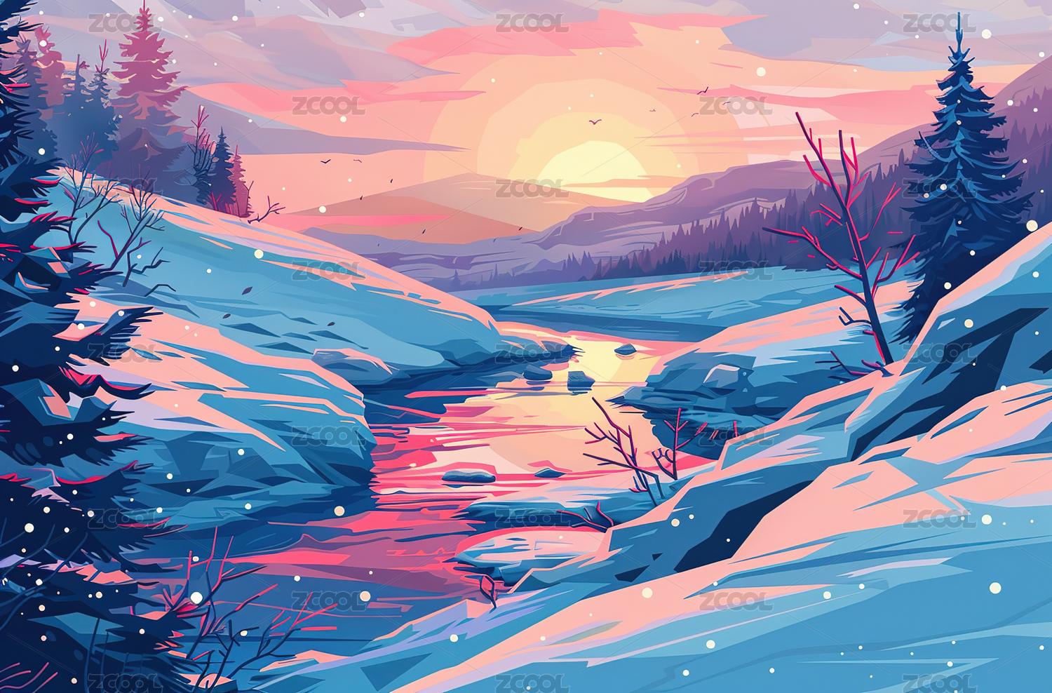 冬季,山谷,河流,雪景,树木,彩色,抽象,艺术,绘画,山脉