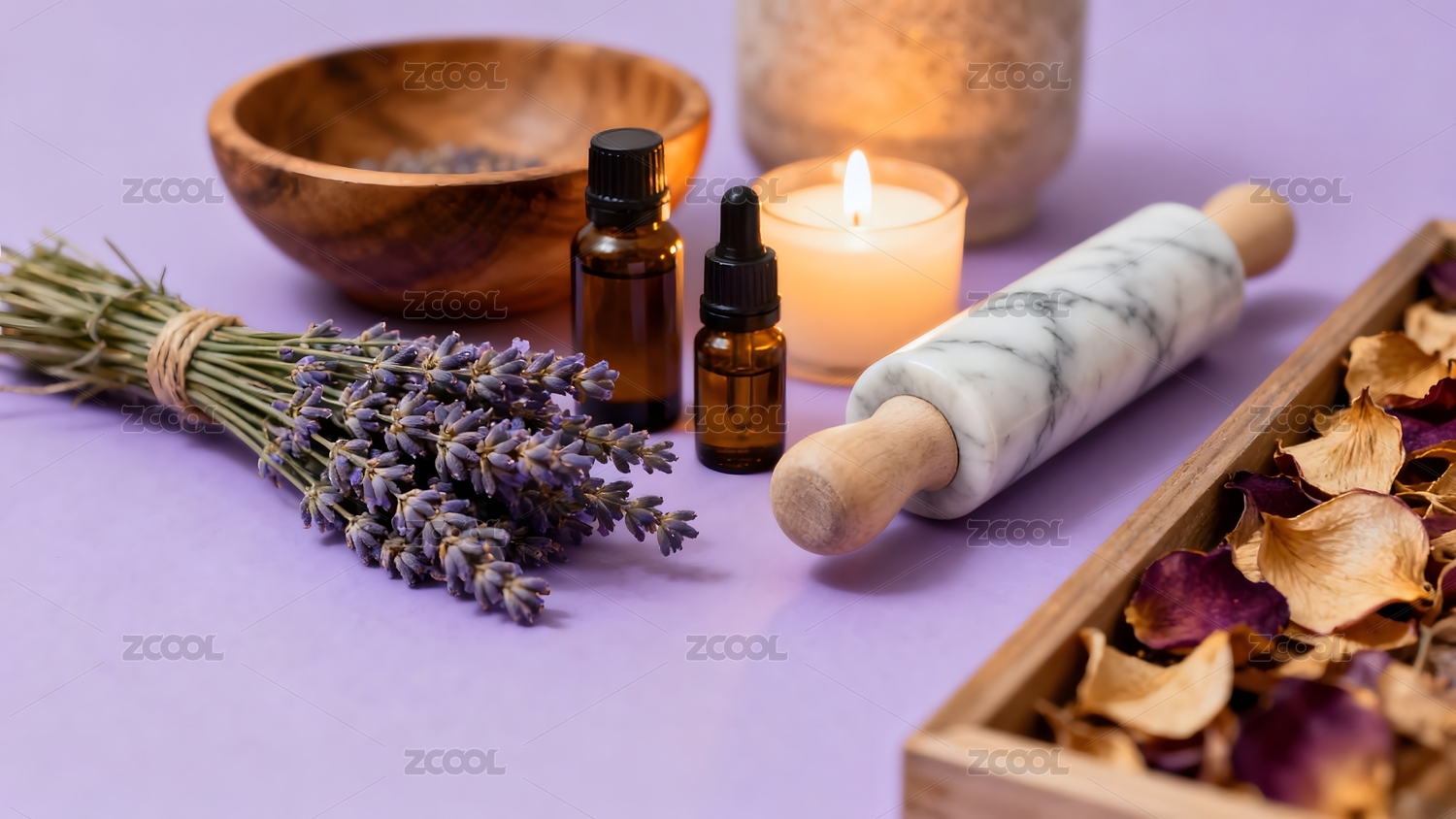 水疗概念,浮花,海绵,精油,蜡烛和木材