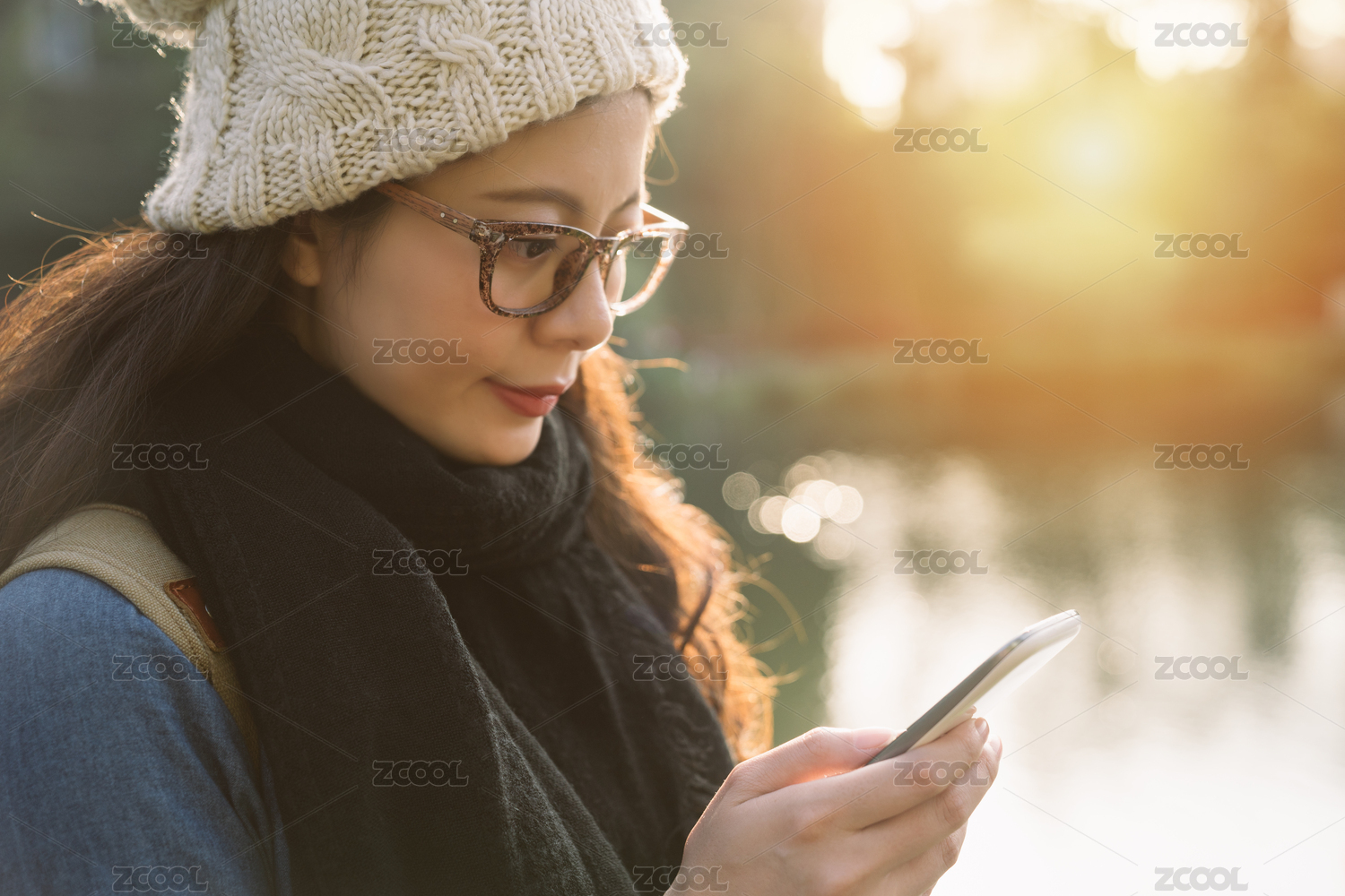 美丽的亚洲女孩发短信消息,并在阳光明媚的温暖日子在冬季。