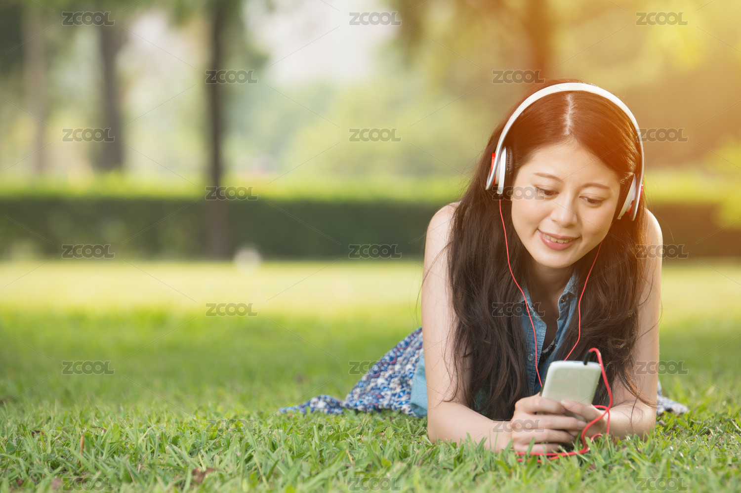 美丽的亚洲女子听音乐与在户外公园草地上的智能手机。大自然户外背景。人才和技术概念