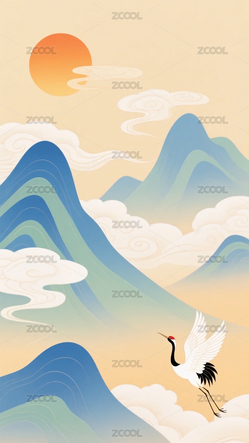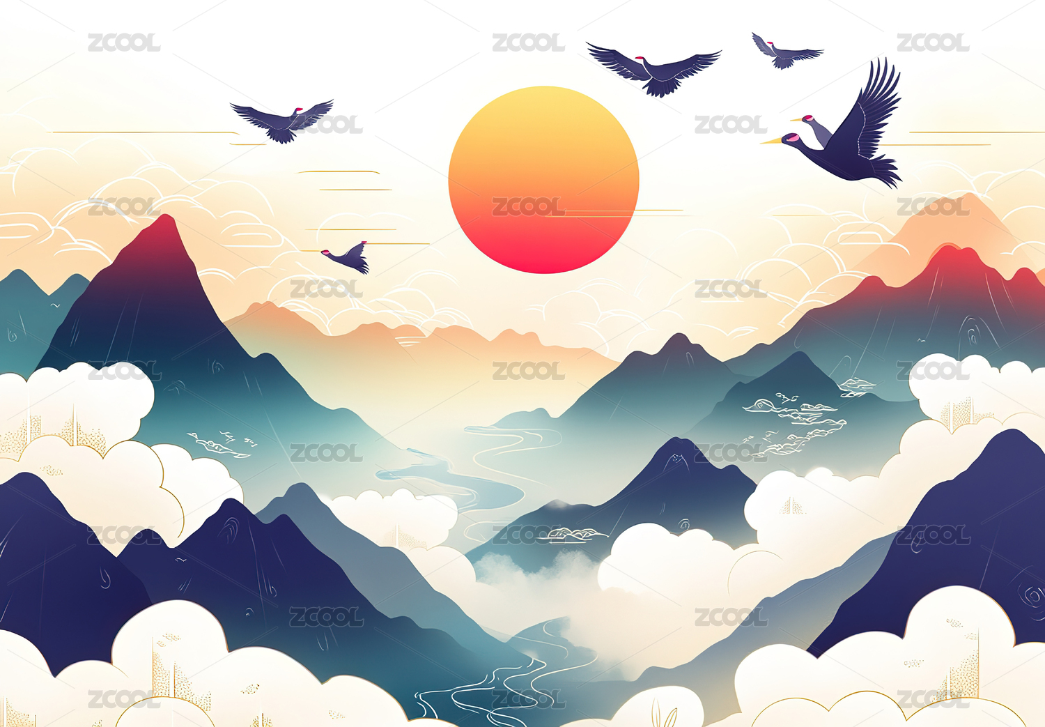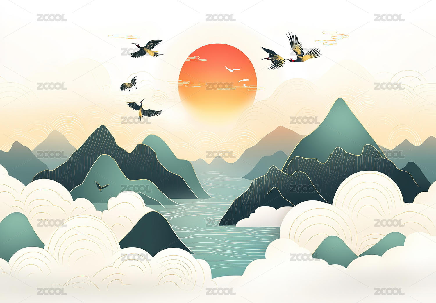 山峰,树木,飞鸟,祥和,宁静,艺术,绘画,水墨画,意境,传统文化
