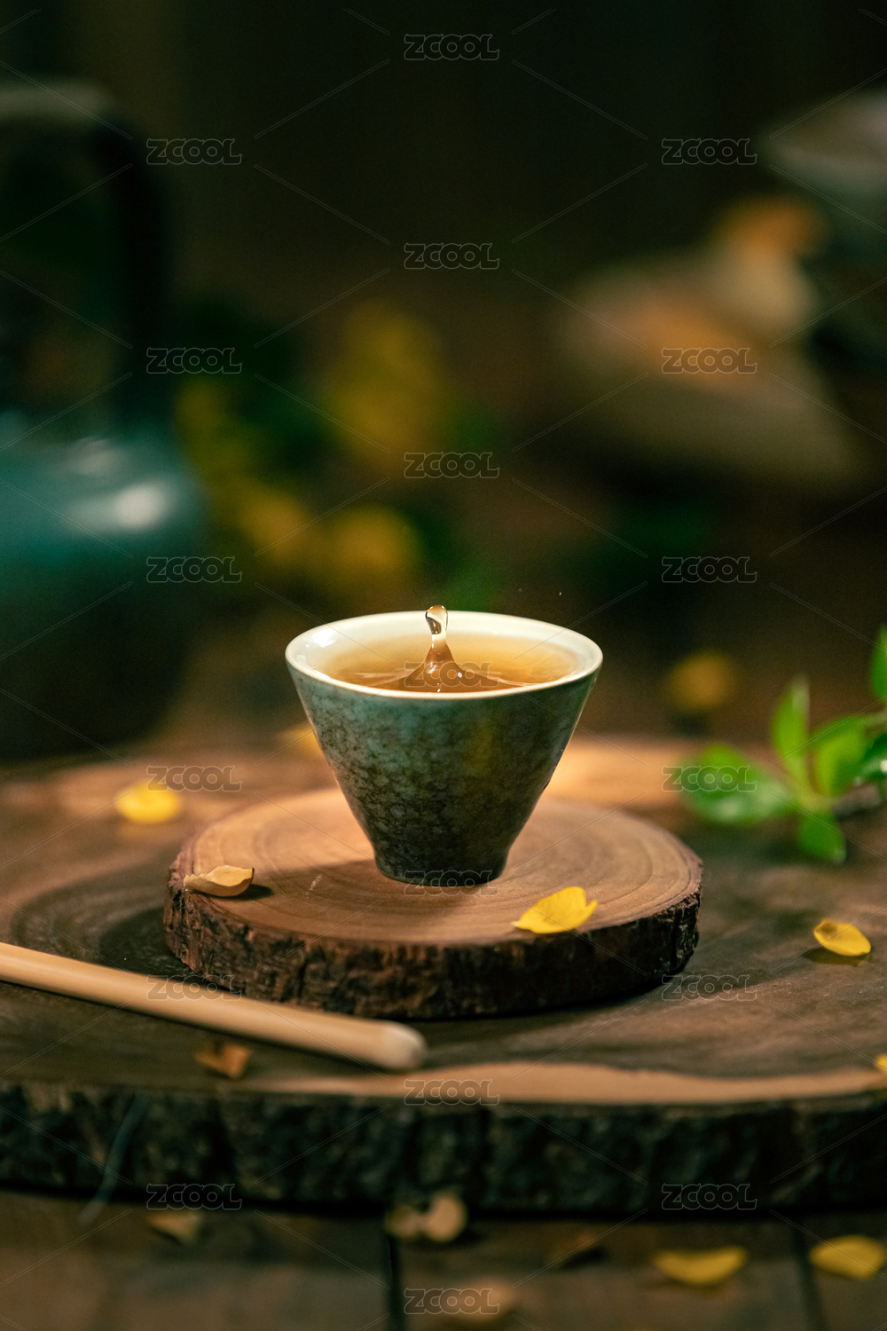 水珠落进木桌上的茶杯