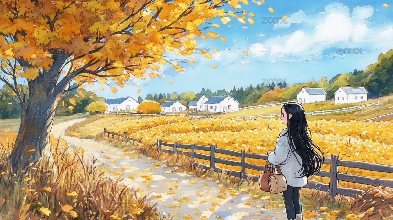 女孩,蓝天,白云,花海,自然,风景,散步,孤独,宁静,浪漫