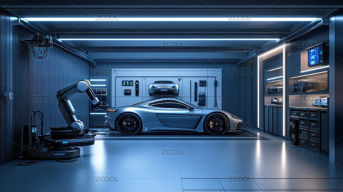 设计,灯光,展示,空间,金属,高端,蓝色,车库,跑车,汽车