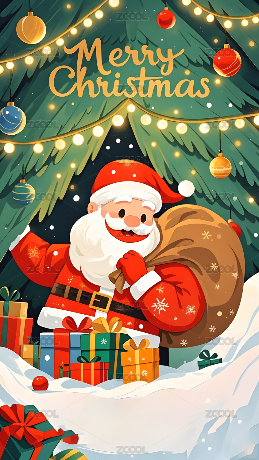 布满彩灯和礼物的圣诞树和圣诞老人
