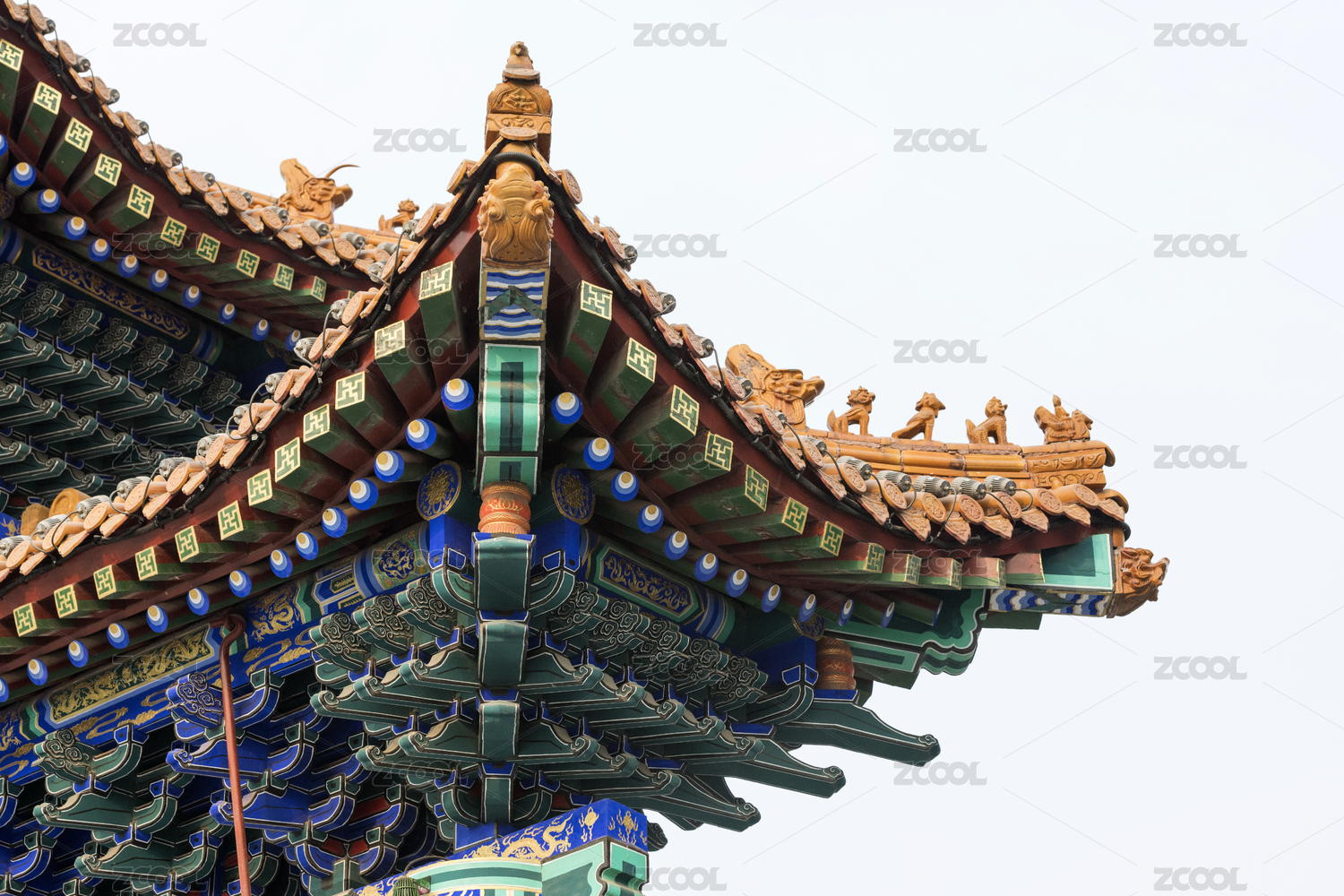 中国北京景山公园古建侧面一角—琉璃瓦屋顶飞檐彩绘描金万字纹龙纹
