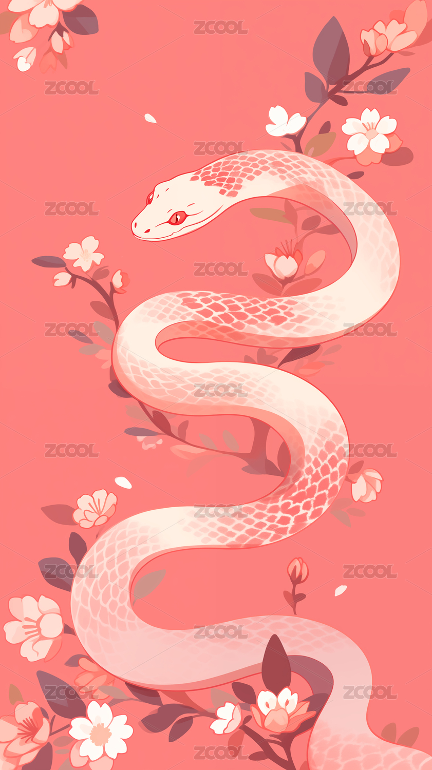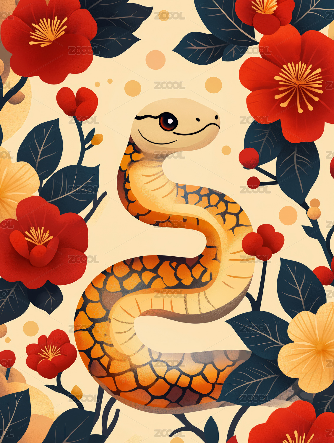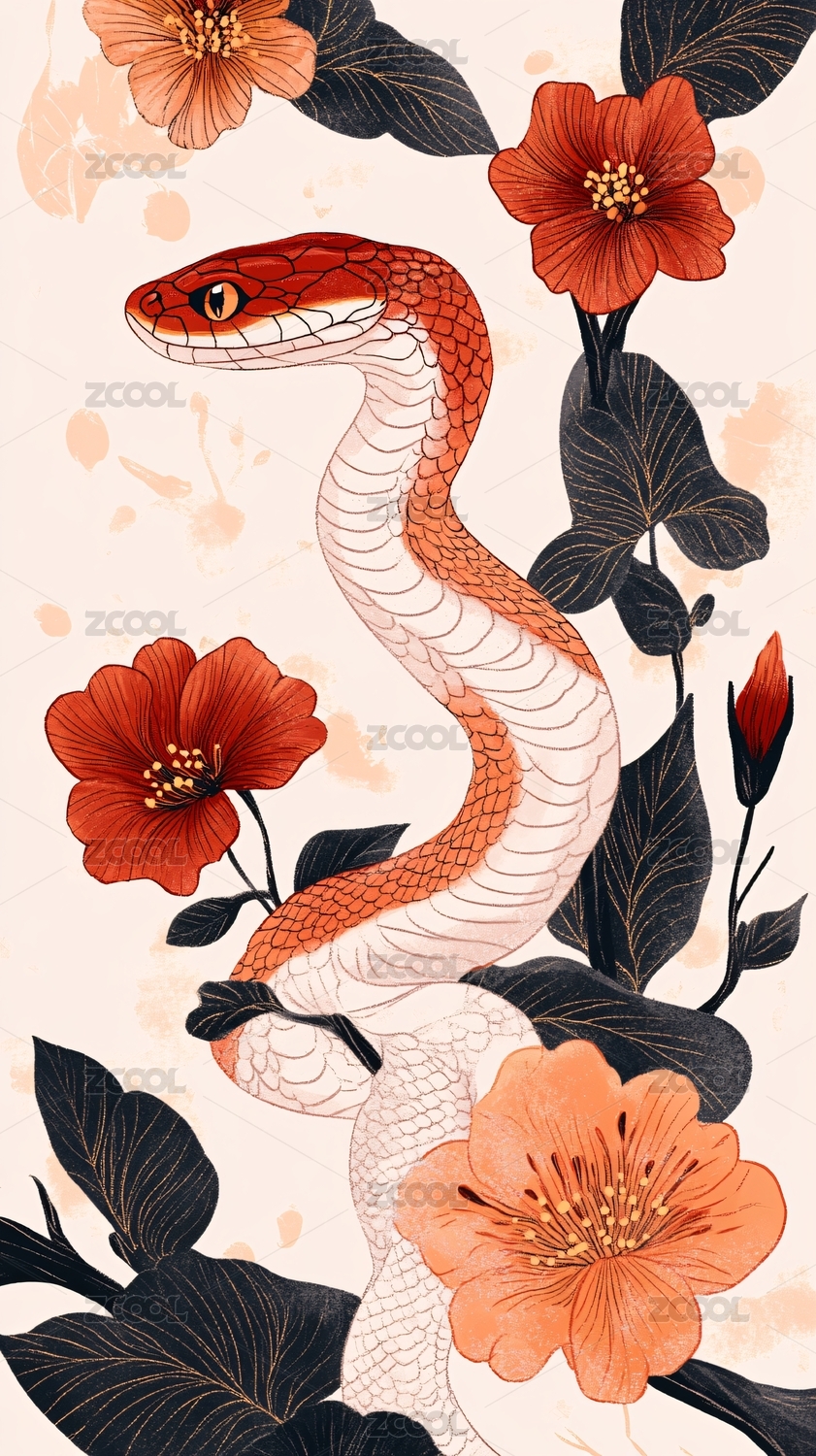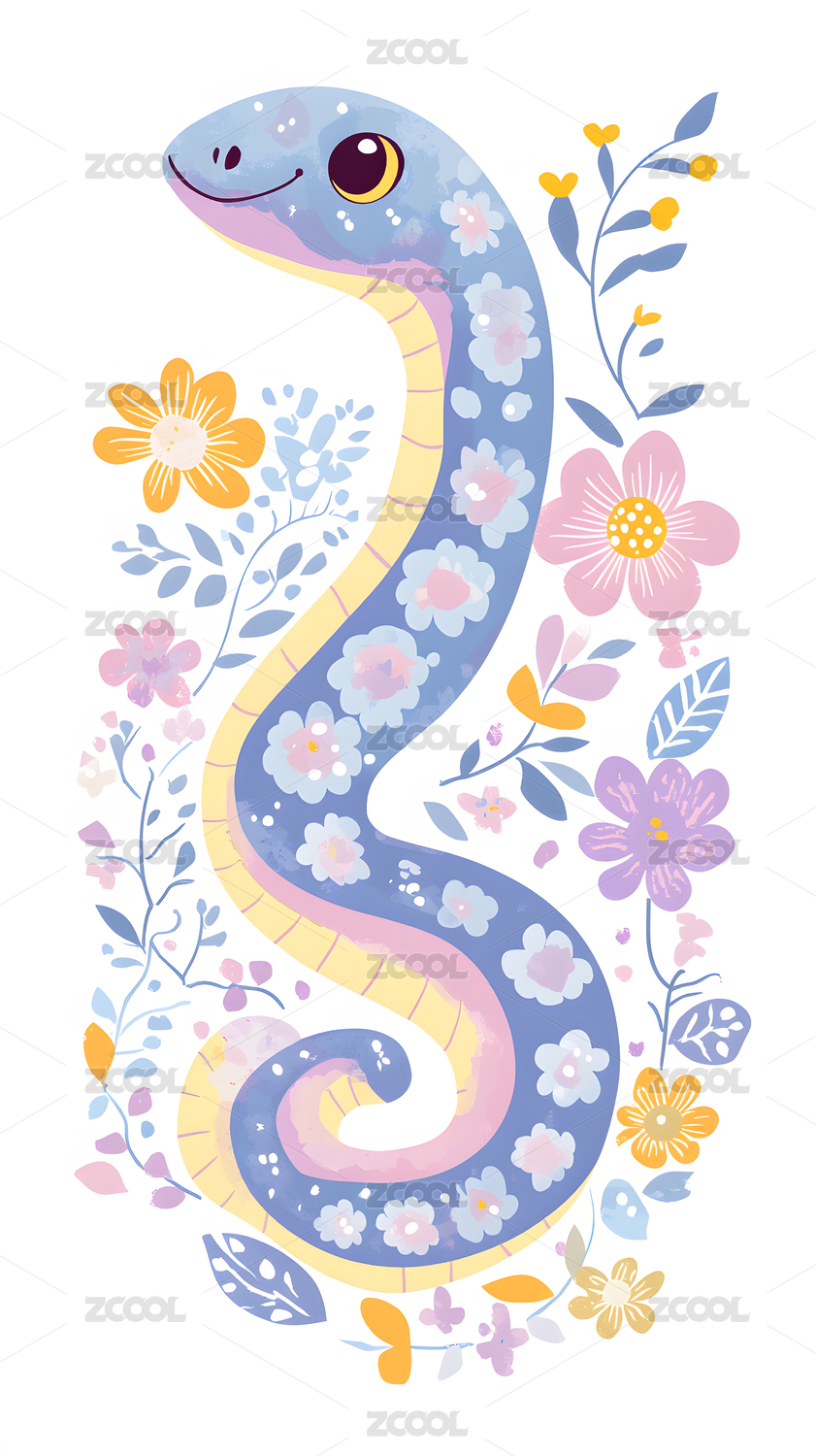 蛇与花原创手绘蛇年水彩梦幻清新装饰插画