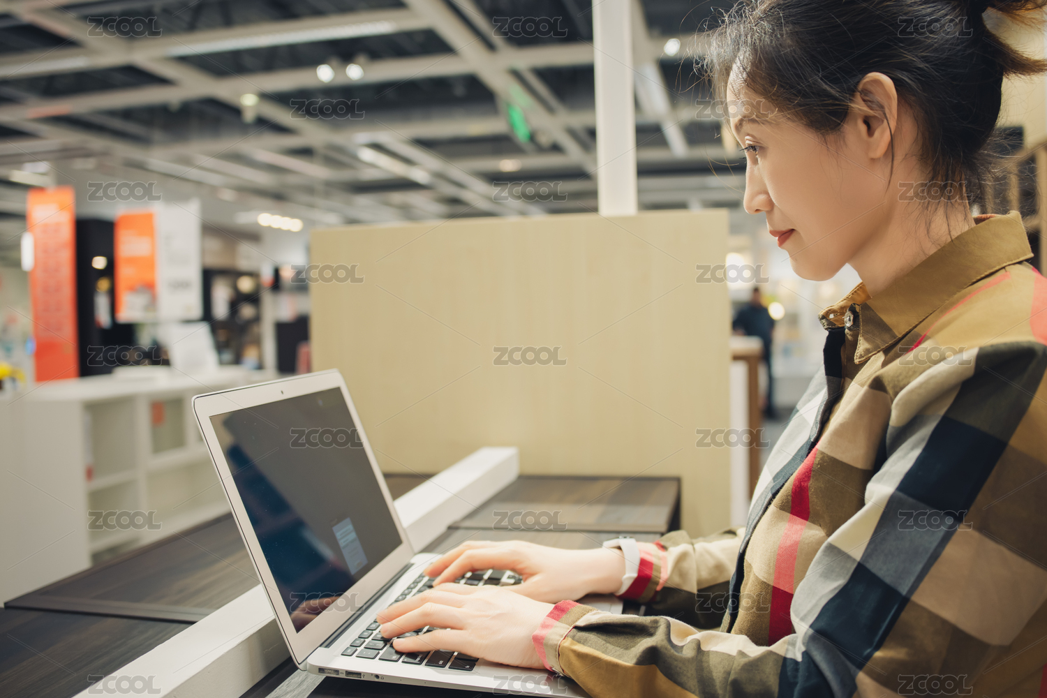 一位年轻的亚洲女性正在商场里面购物