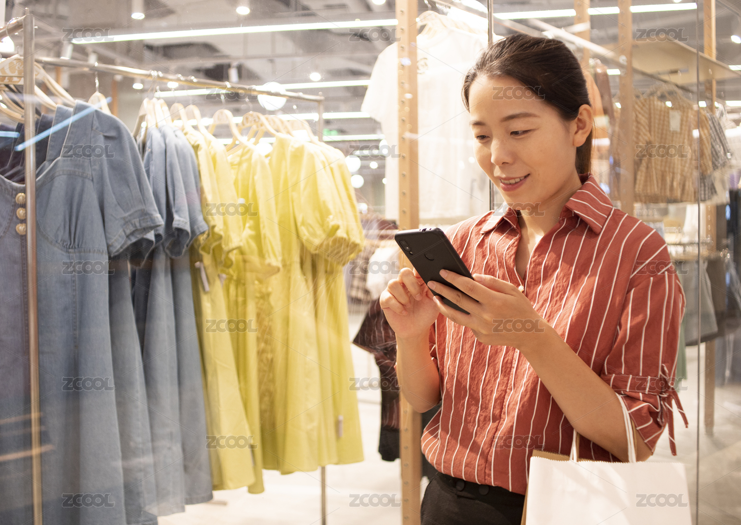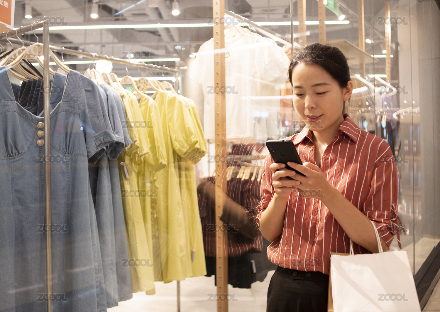 年轻女子在现代零售服装店购物