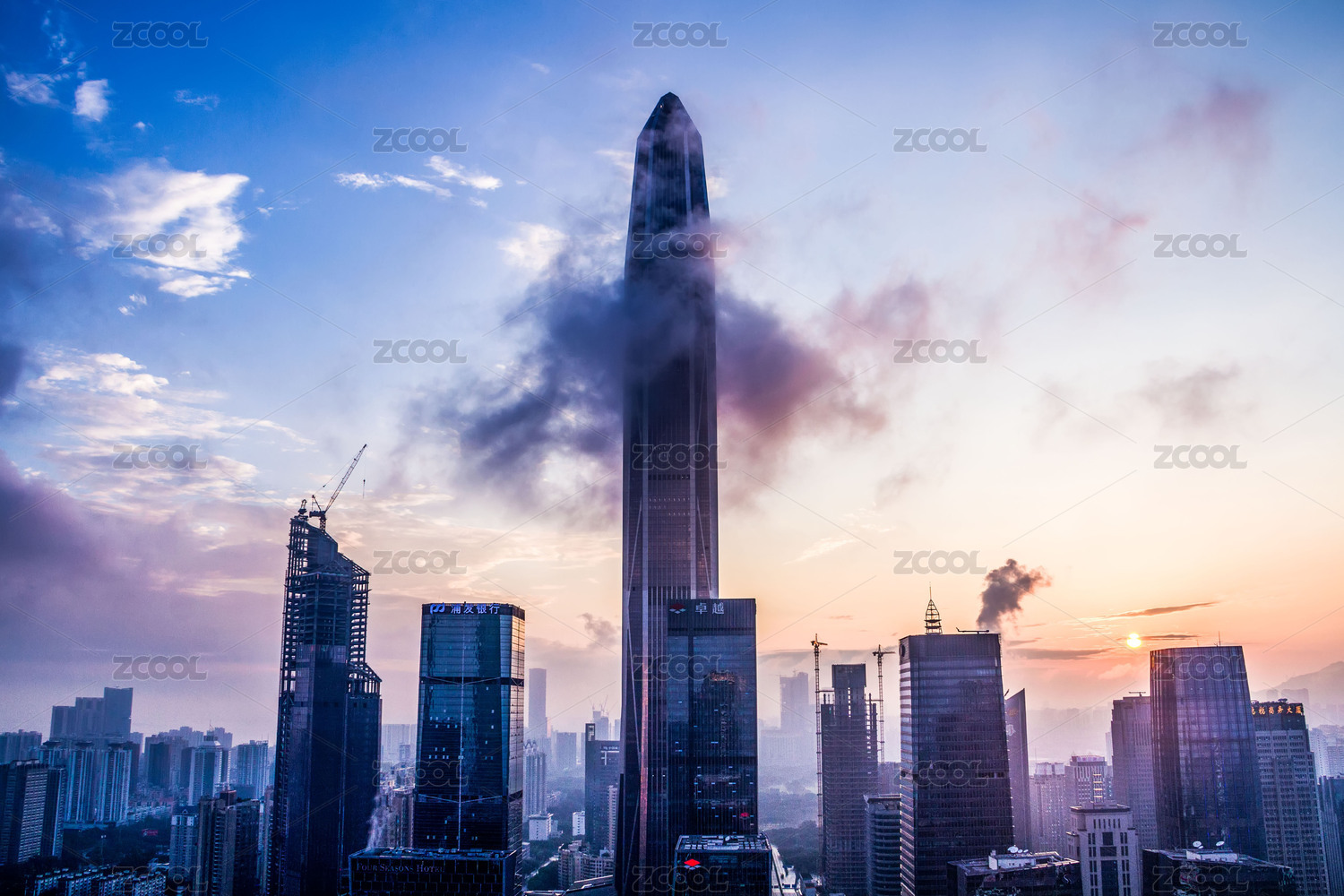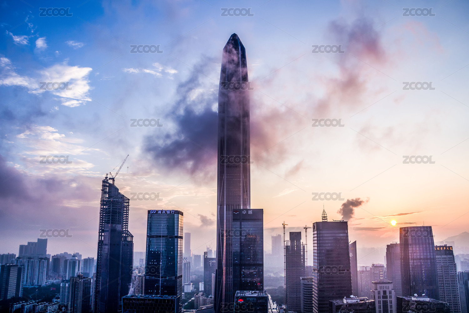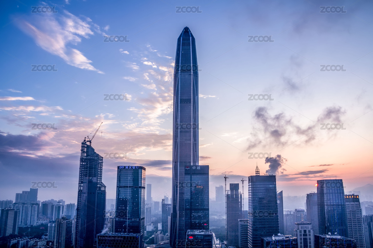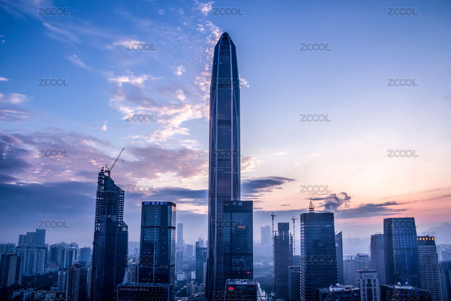 中国深圳市福田区城市天际线建筑群高楼大厦晚霞风光,平安金融中心