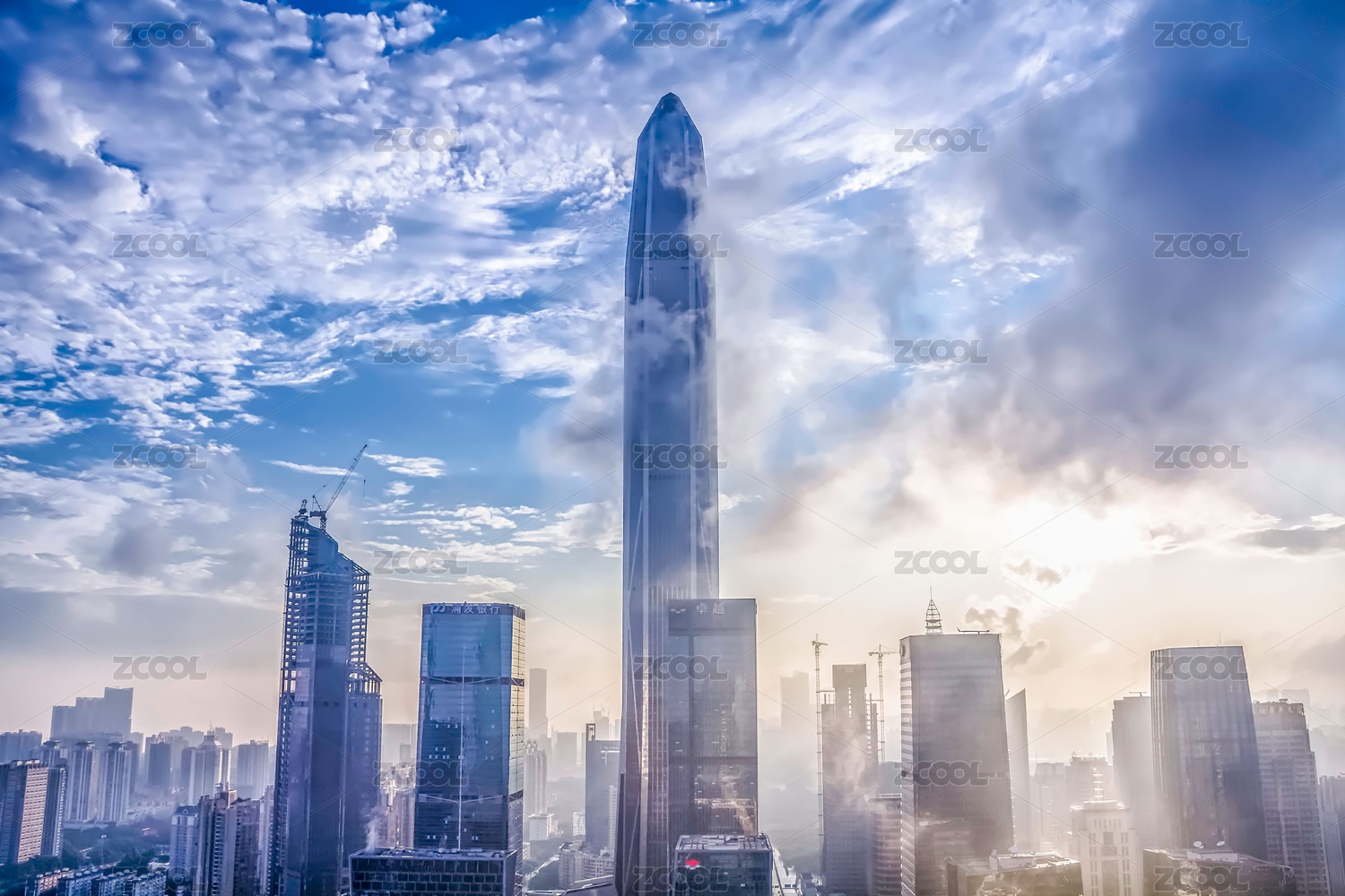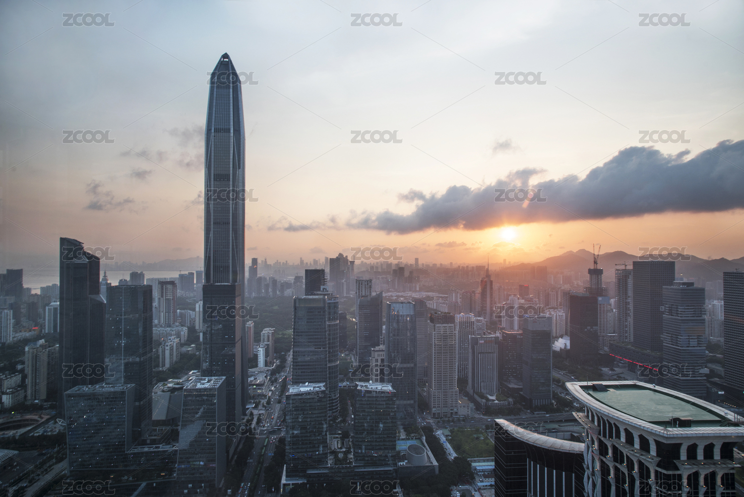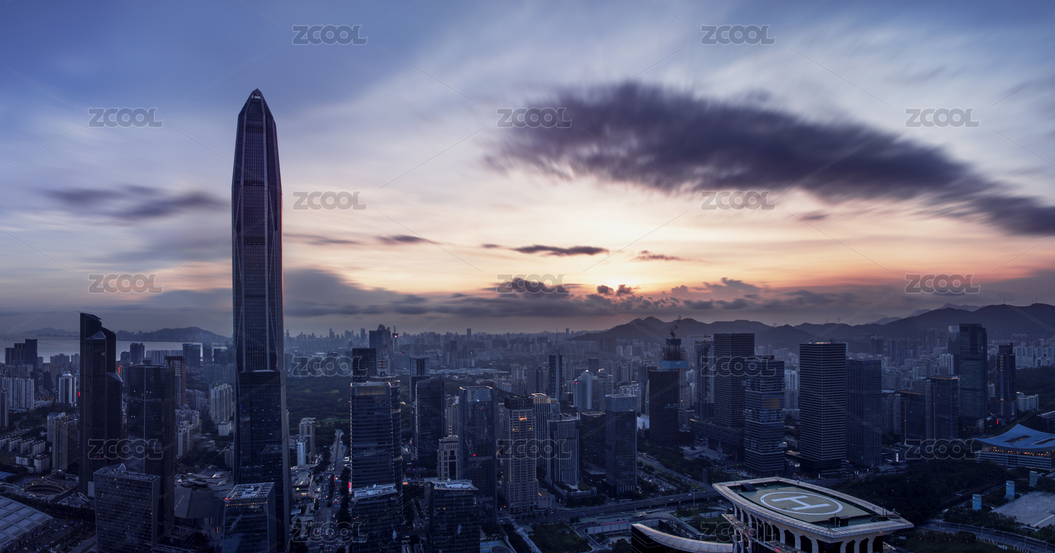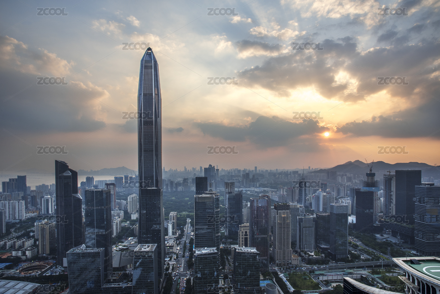 鸟瞰中国广东省深圳平安大厦天际线建筑群高楼大厦夕阳黄昏风光