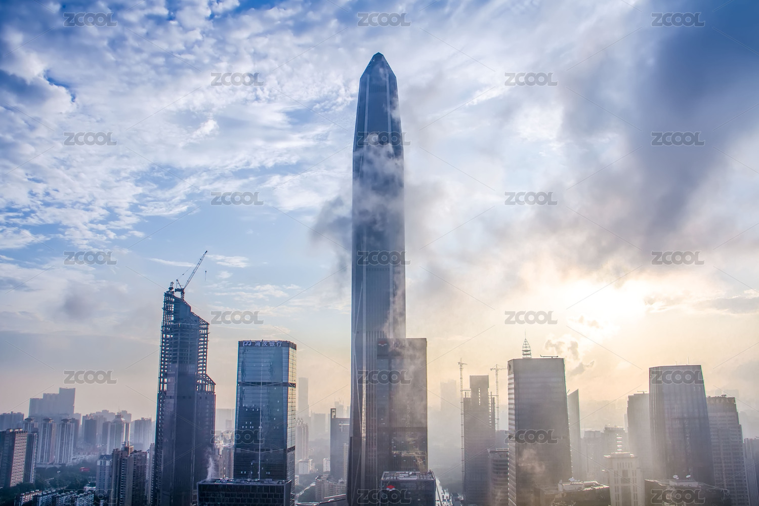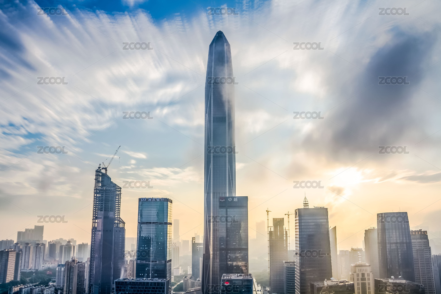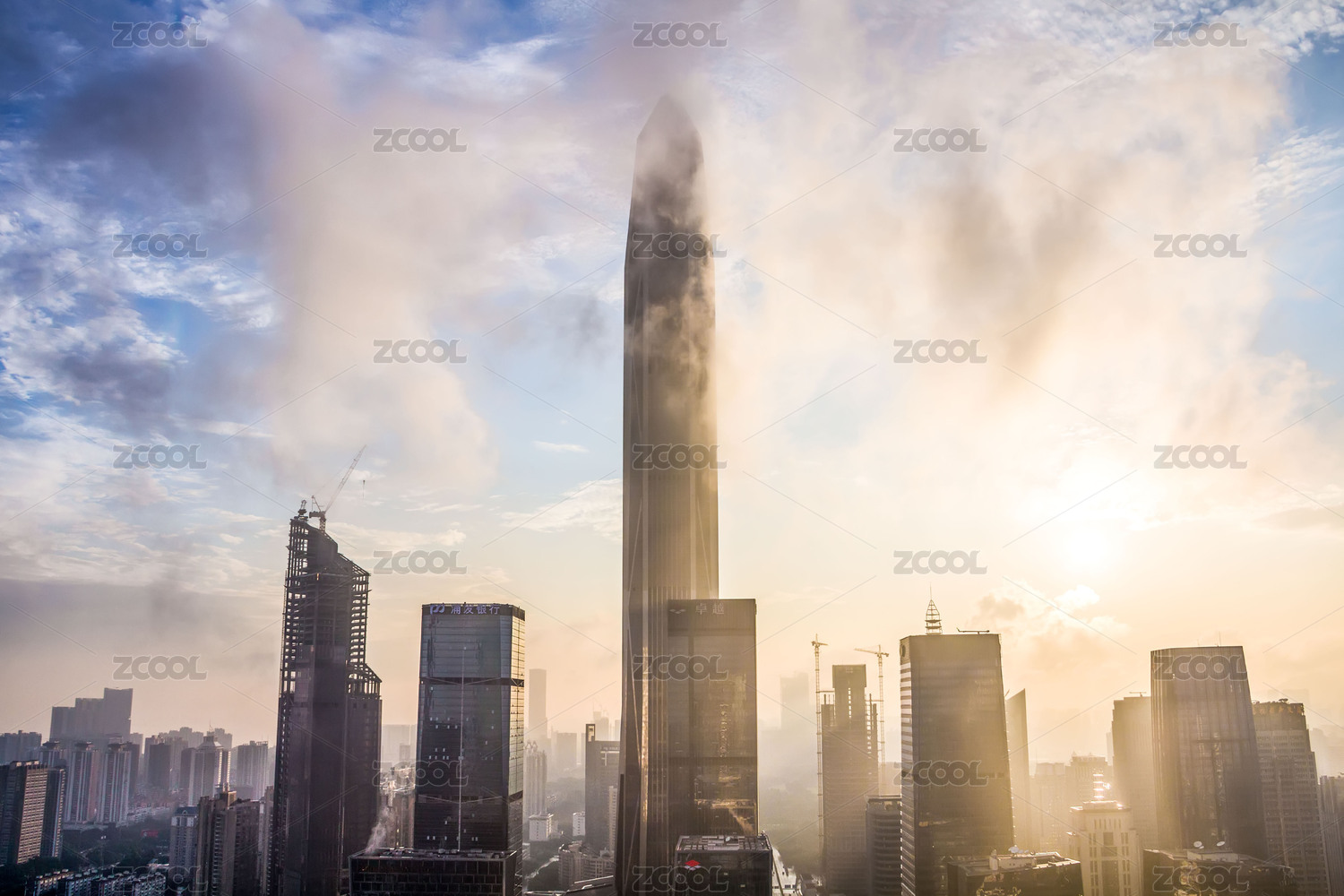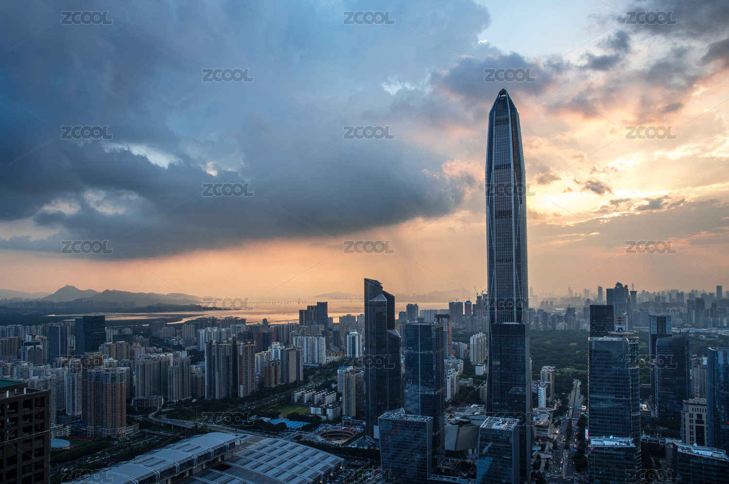夕阳下的中国广东省深圳平安大厦天际线建筑群风光
