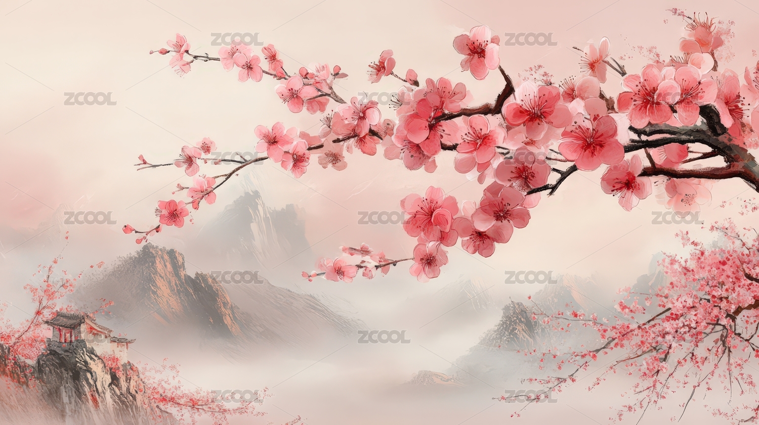 粉红桃花与山峦景色