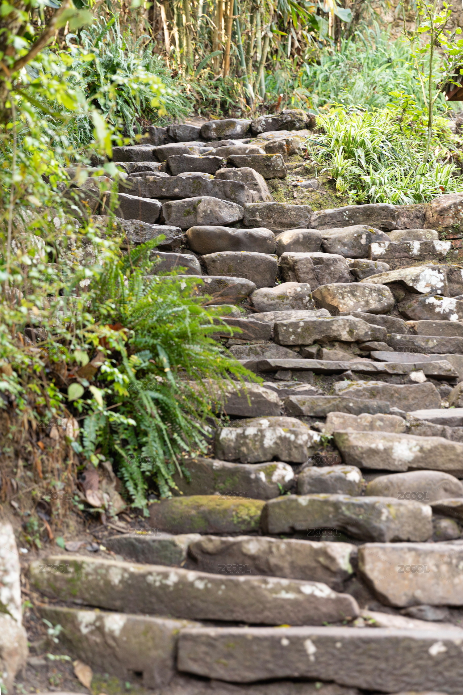 竹林绿色植物中有台阶延伸铺满石块的小路
