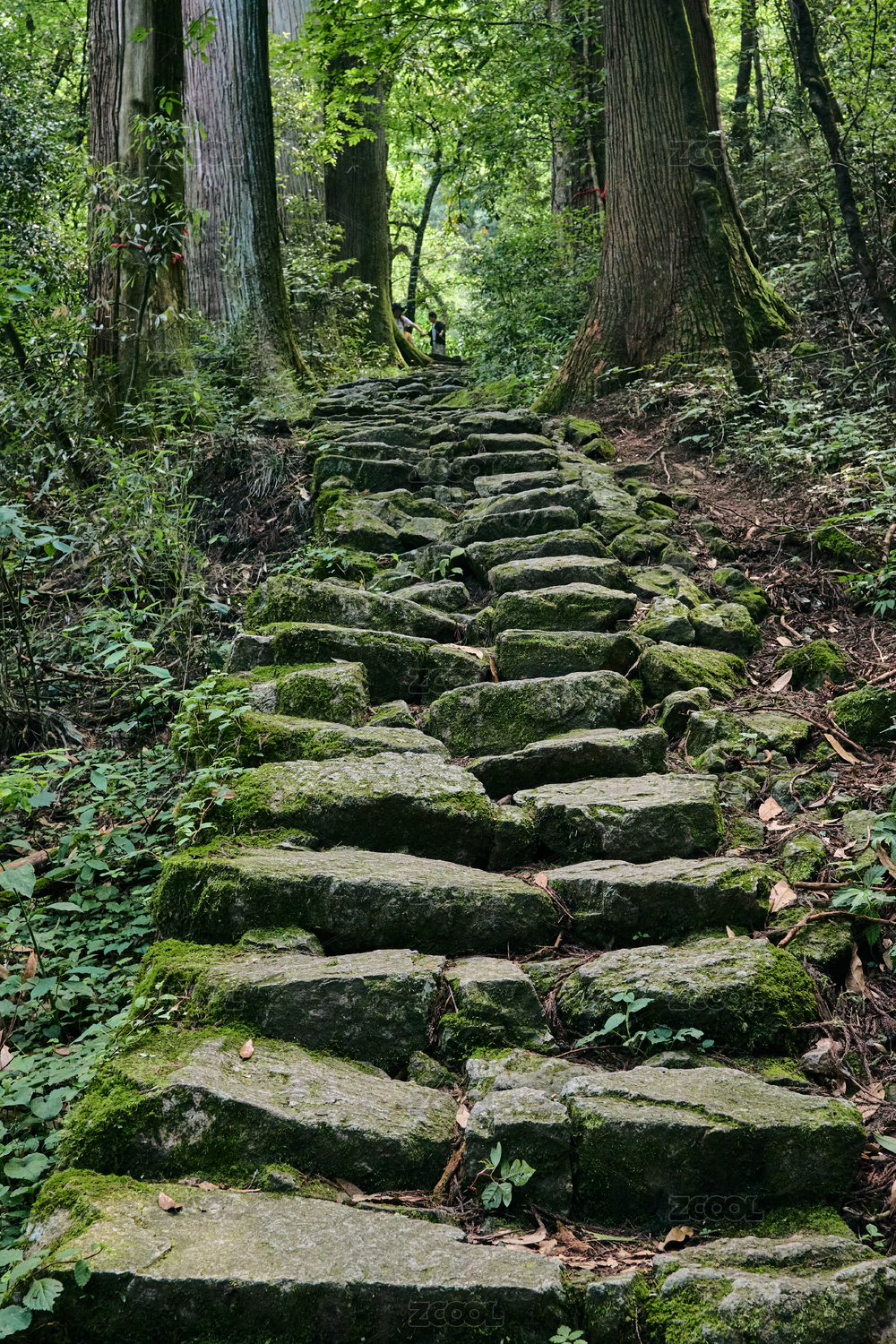 夏至时节走在蜿蜒崎岖的森林青石板路上