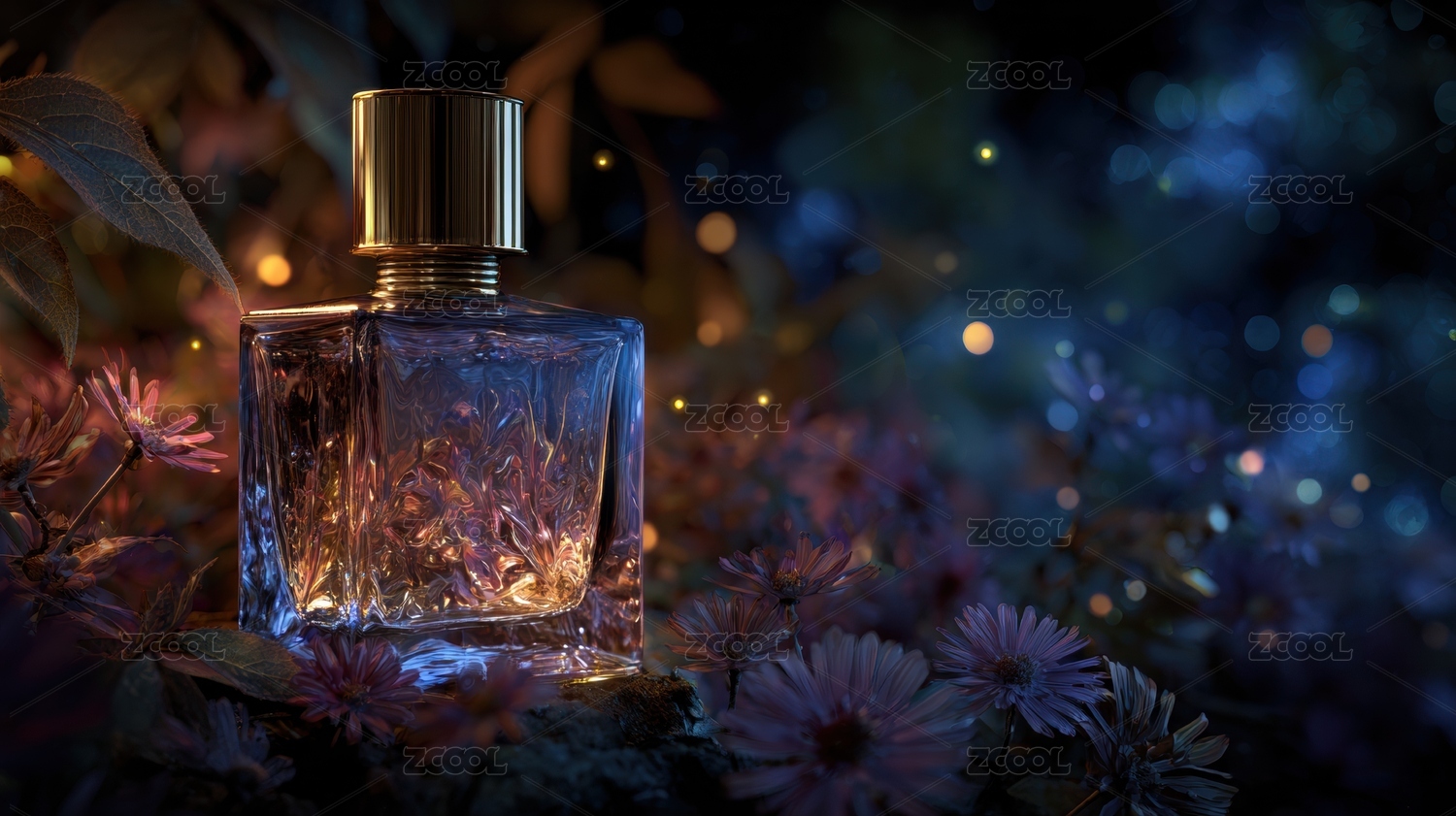 香水瓶置于花丛中夜景灯光闪烁