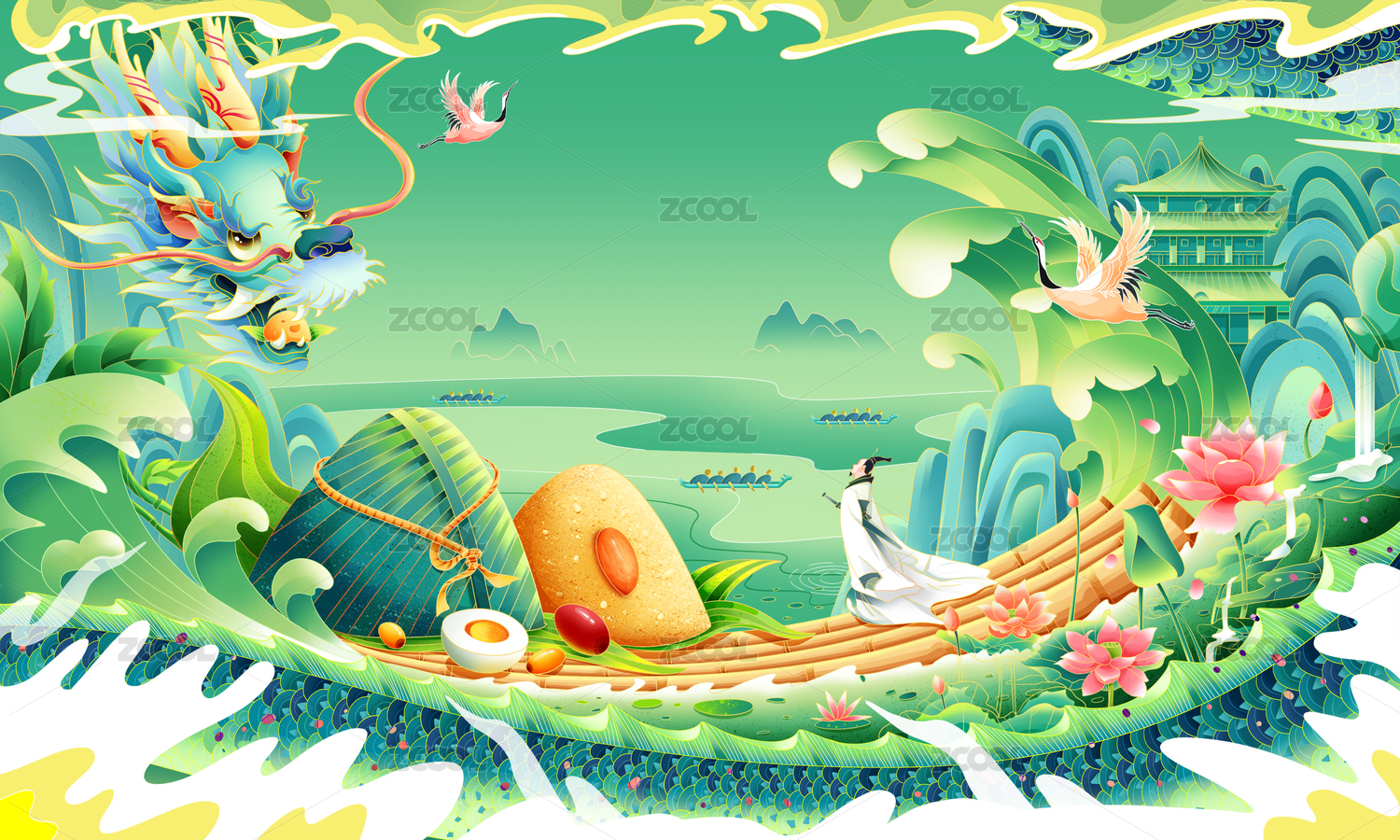 五月初五端午节快乐卡通粽子赛龙舟国潮插画