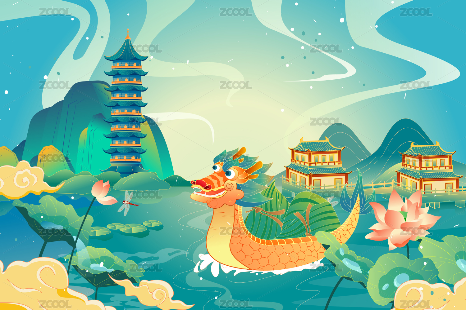 端午节赛龙舟传统节日建筑美食古风国潮插画