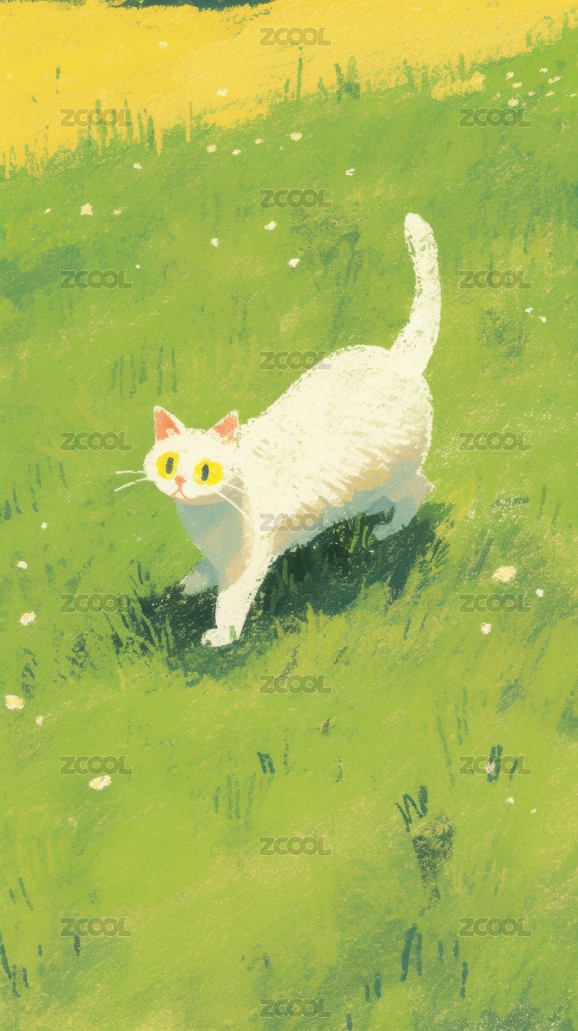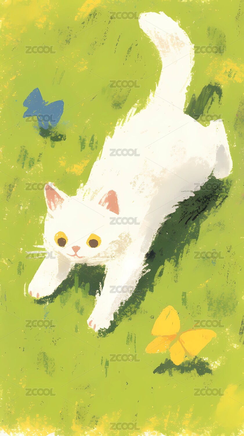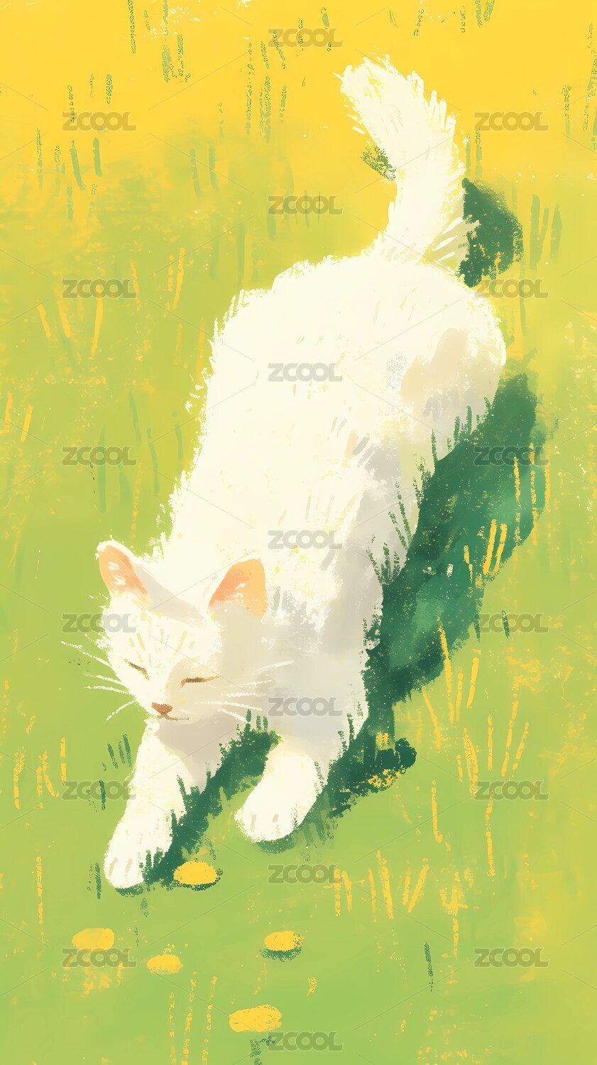 可爱蜡笔彩铅手绘肌理感小白猫手机插画壁纸