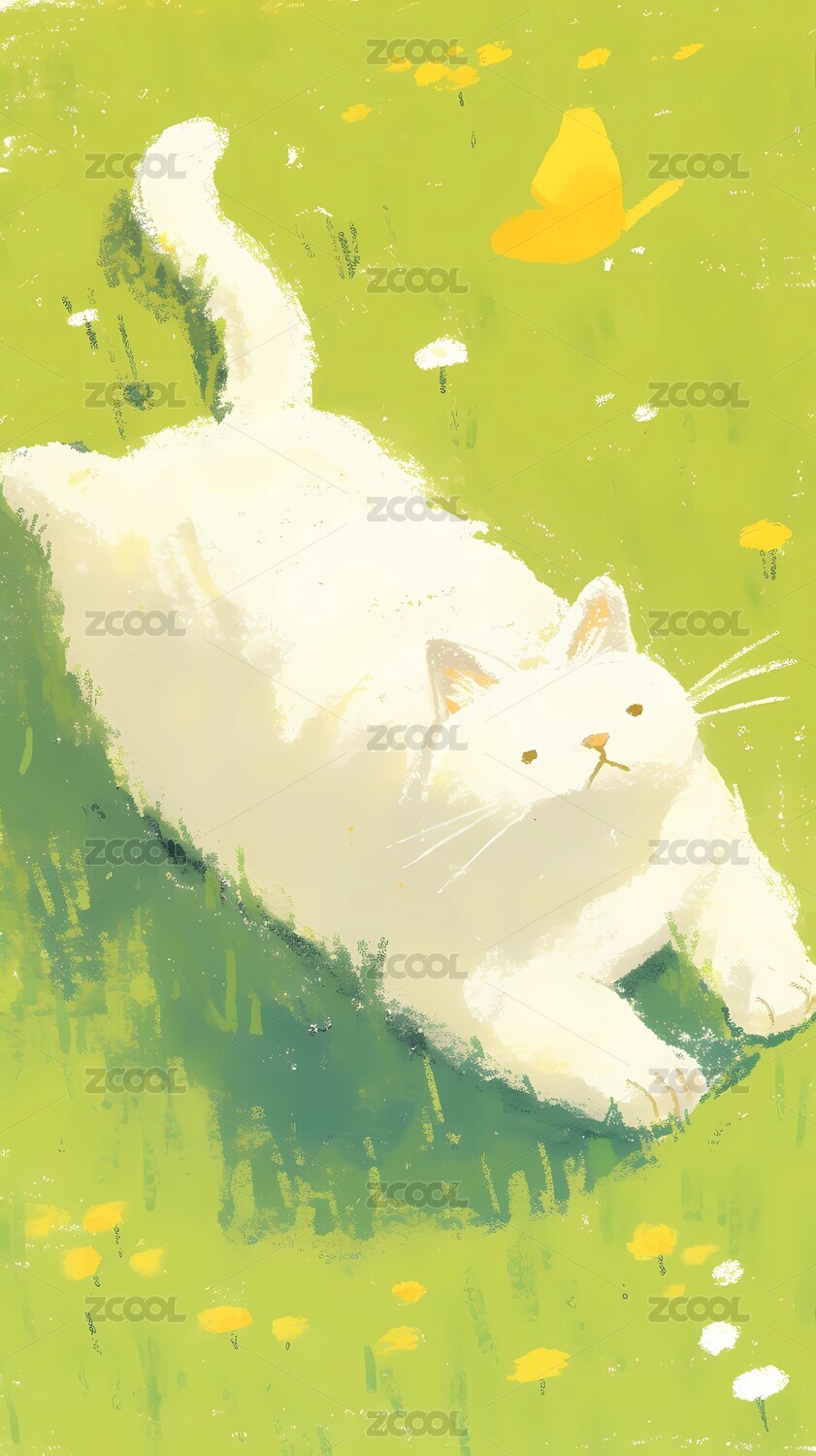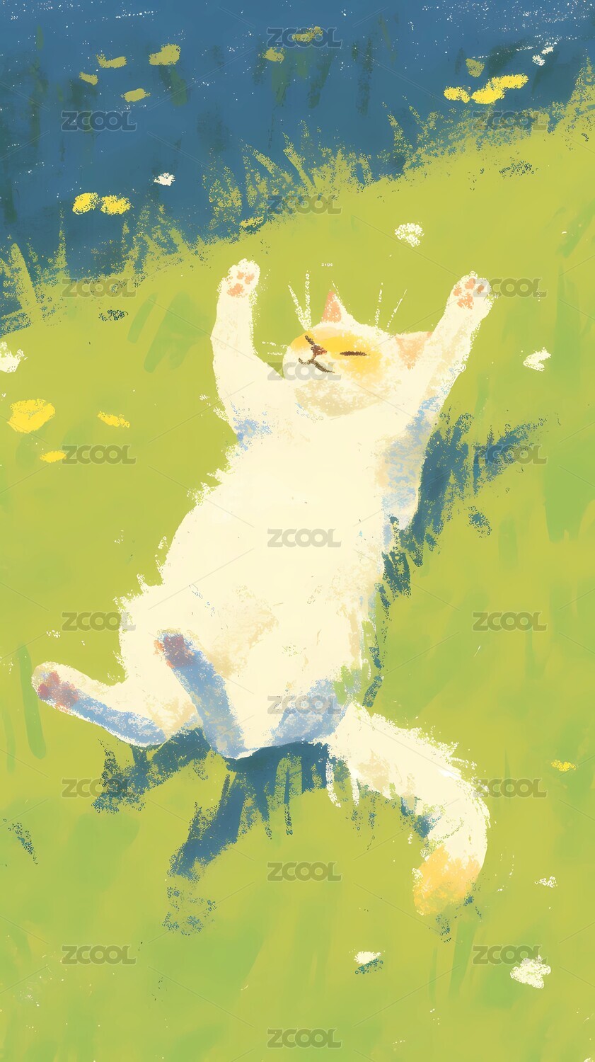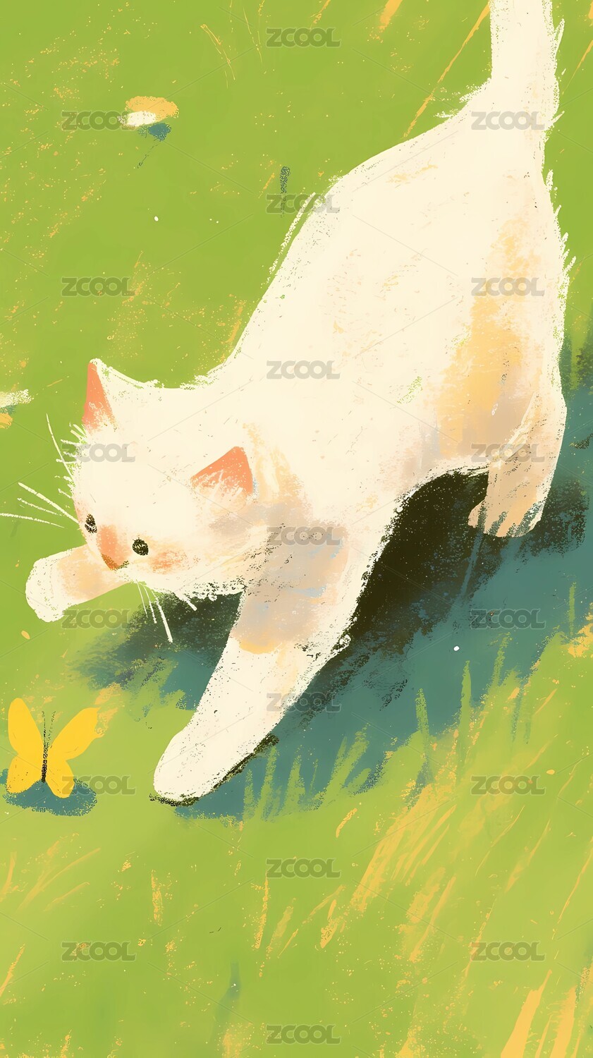 可爱蜡笔彩铅手绘肌理感小白猫手机插画壁纸