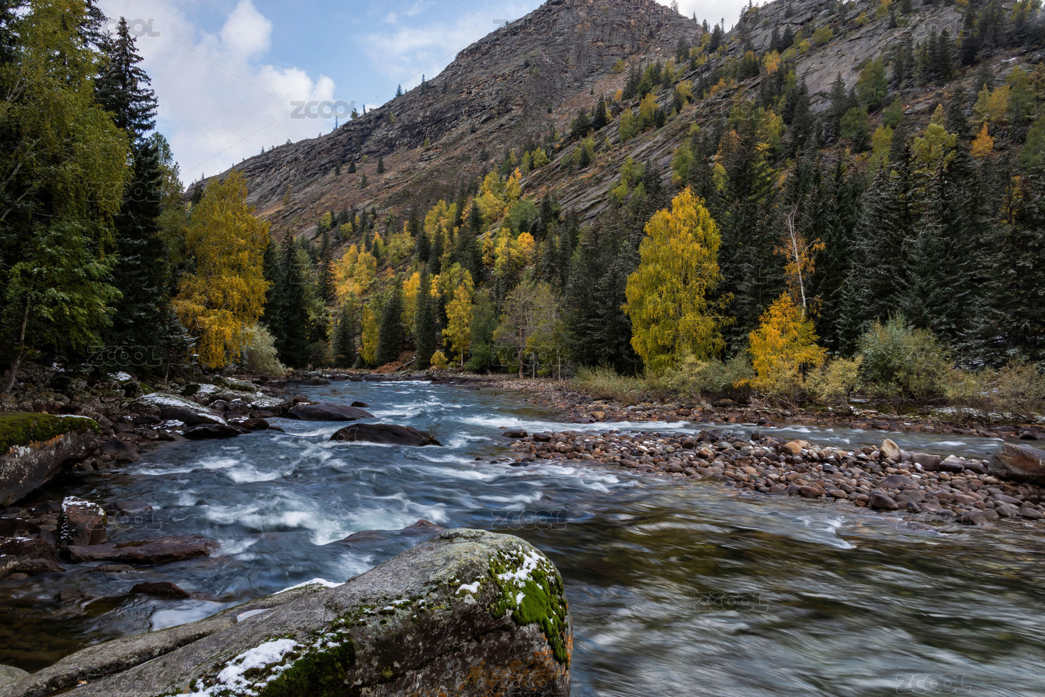 中国新疆可可托海峡谷河流秋天秋色秋景