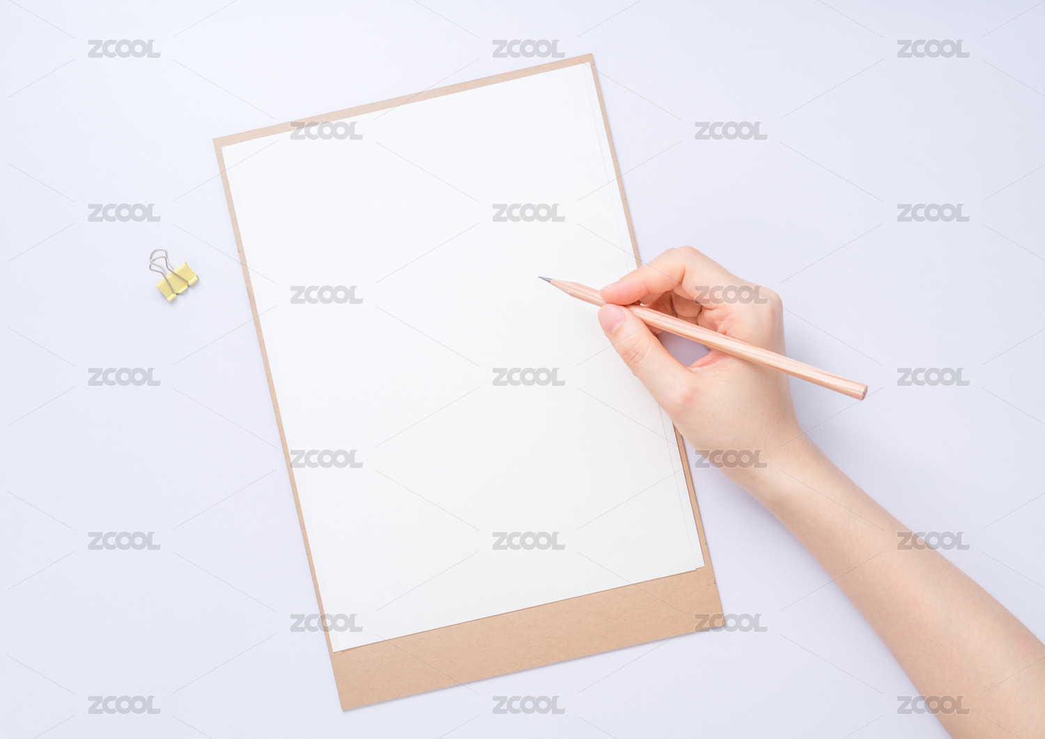 原木桌面上放着一叠白纸,旁边放着一只铅笔
