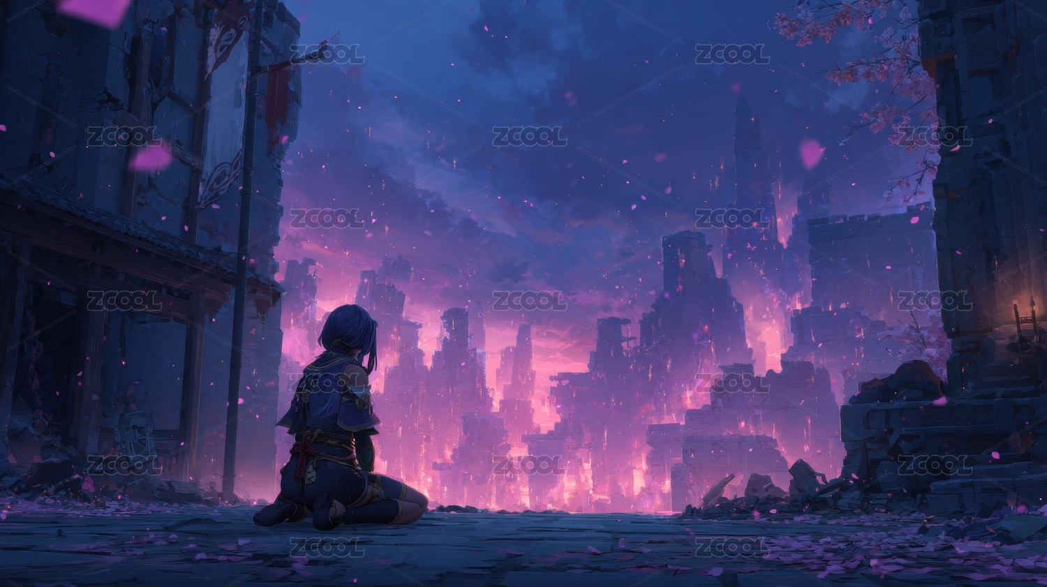 一个女孩站在巨大宏伟的城堡前动漫场景