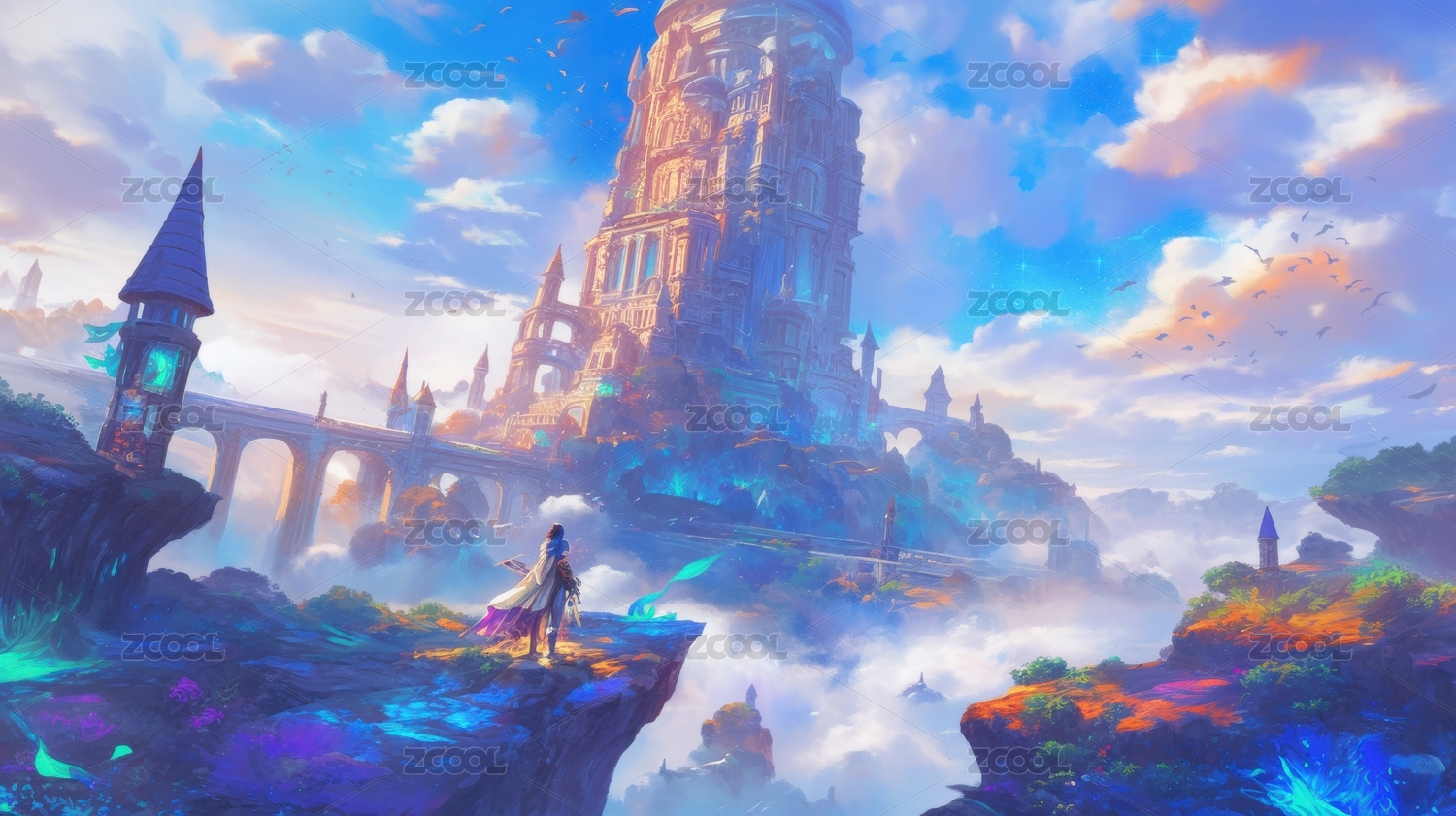空中城堡空中花园天空之城岛屿蓝天白云奇幻