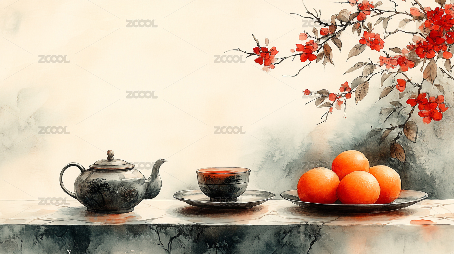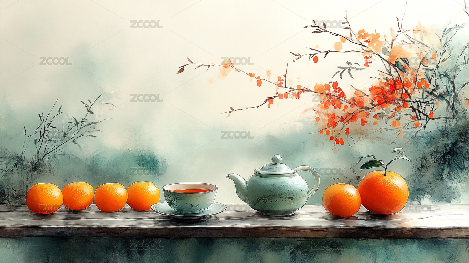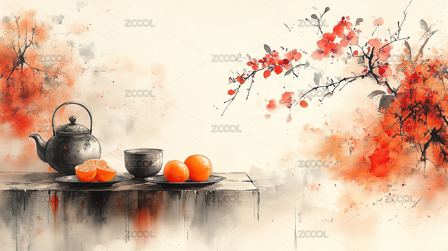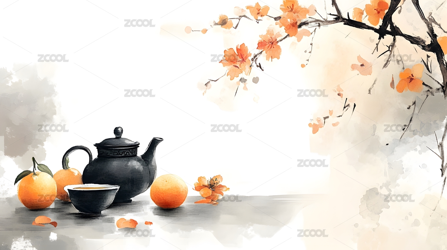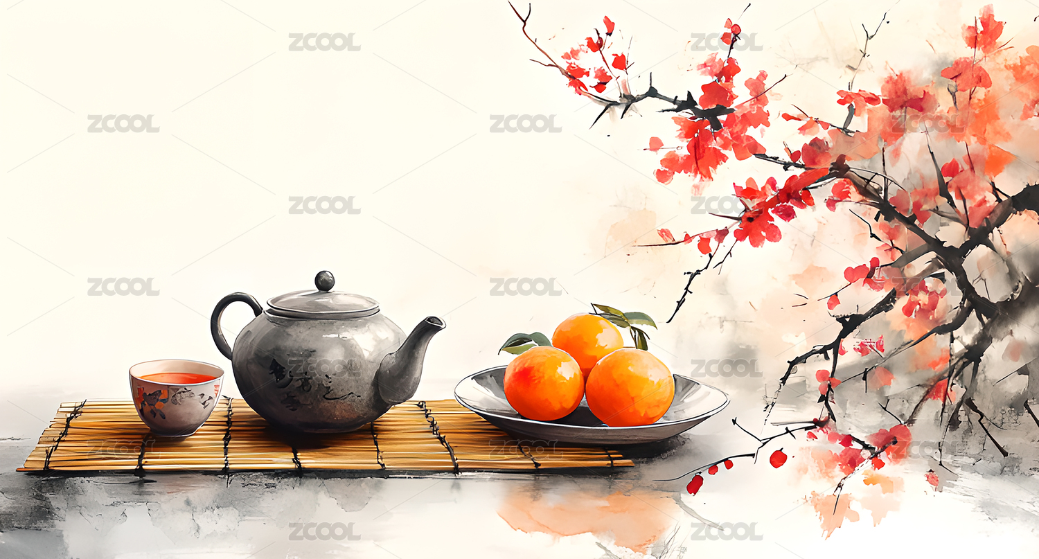 茶叶,煮茶,茶杯,茶壶,橘子,砂糖橘,柿子,梅花,红梅,盛开