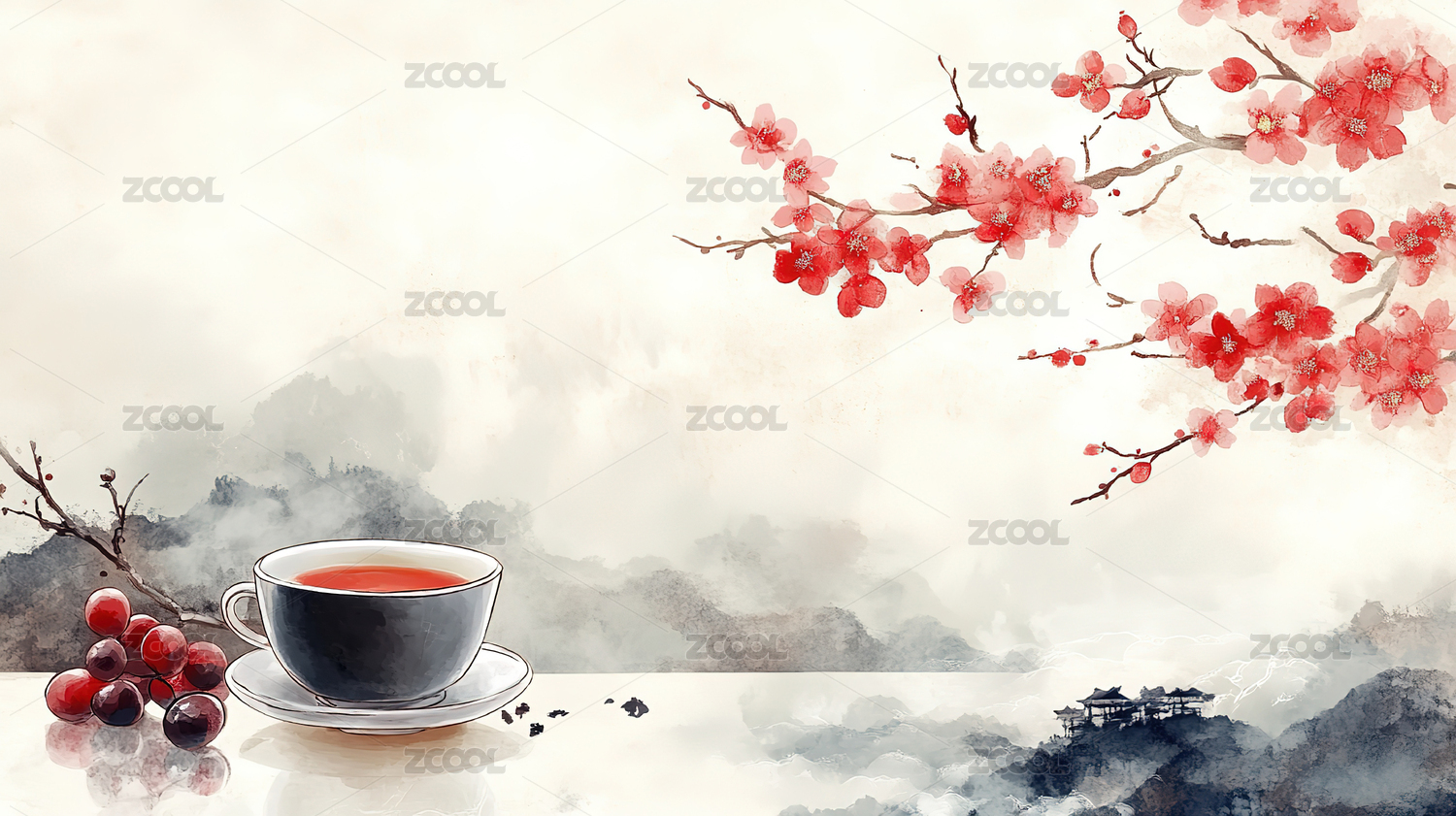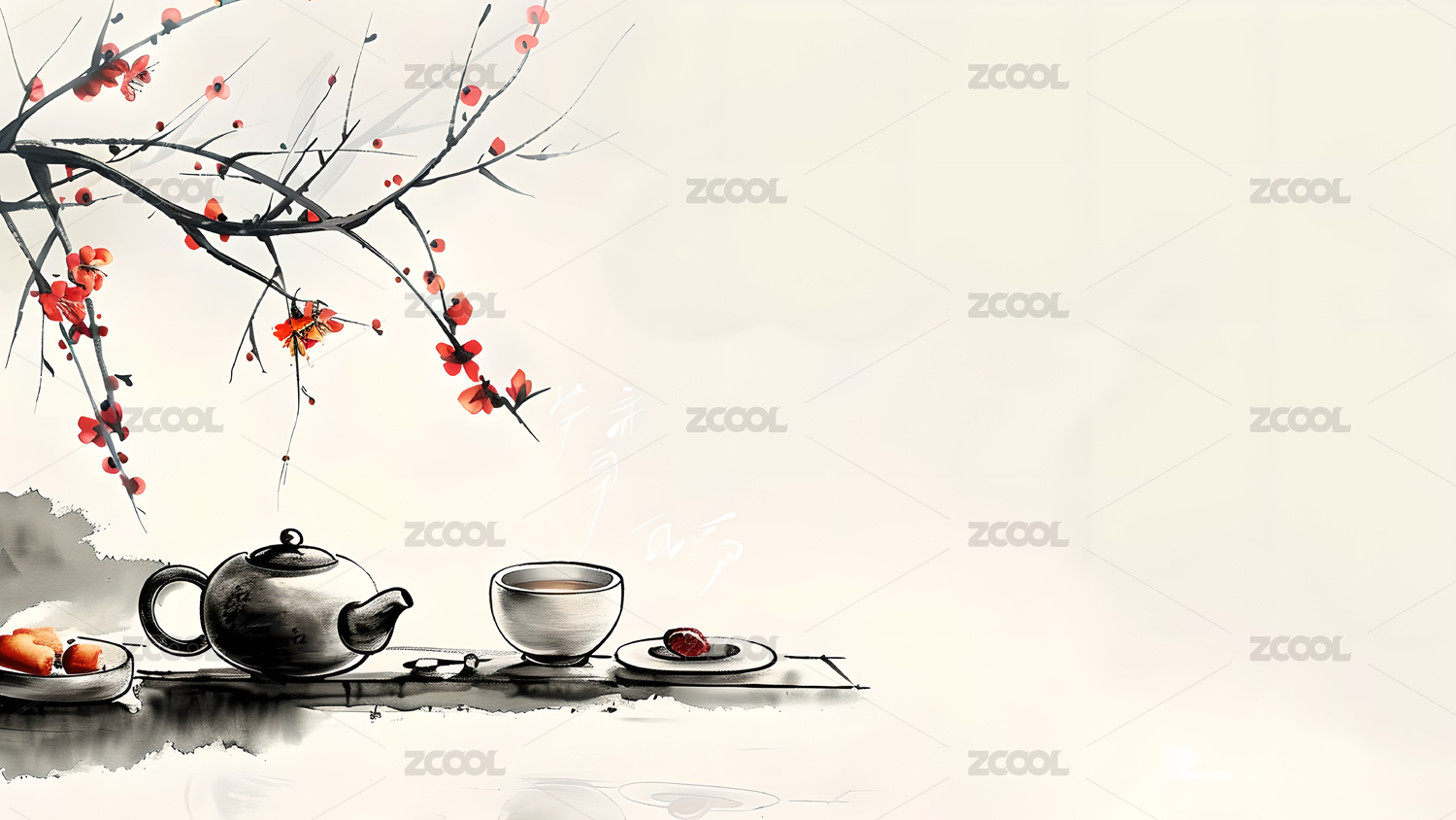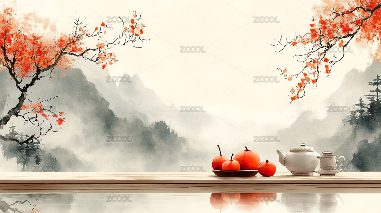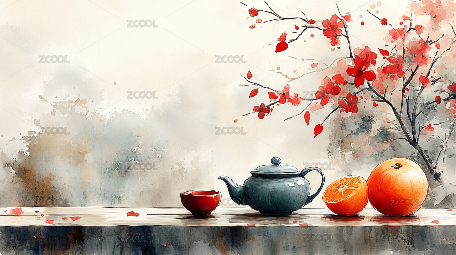 茶叶,煮茶,茶杯,茶壶,橘子,砂糖橘,柿子,梅花,红梅,盛开
