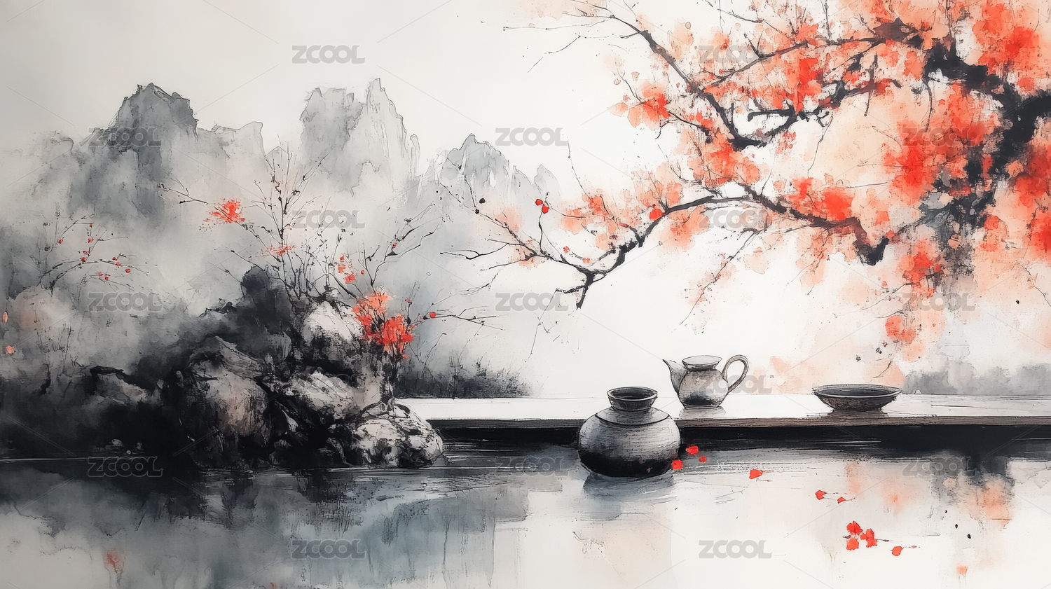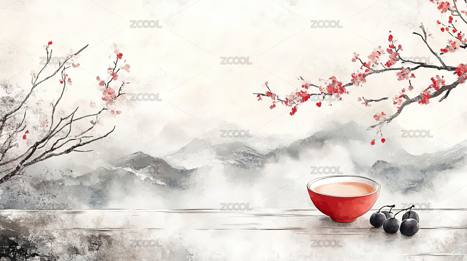红梅盛开的背景下围炉煮茶中国风壁纸
