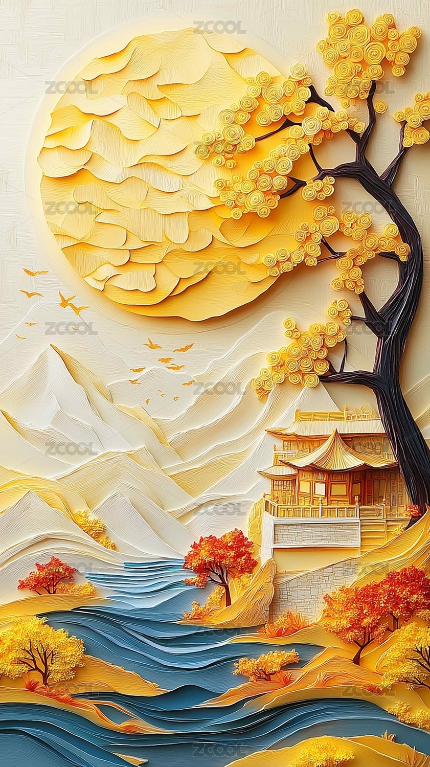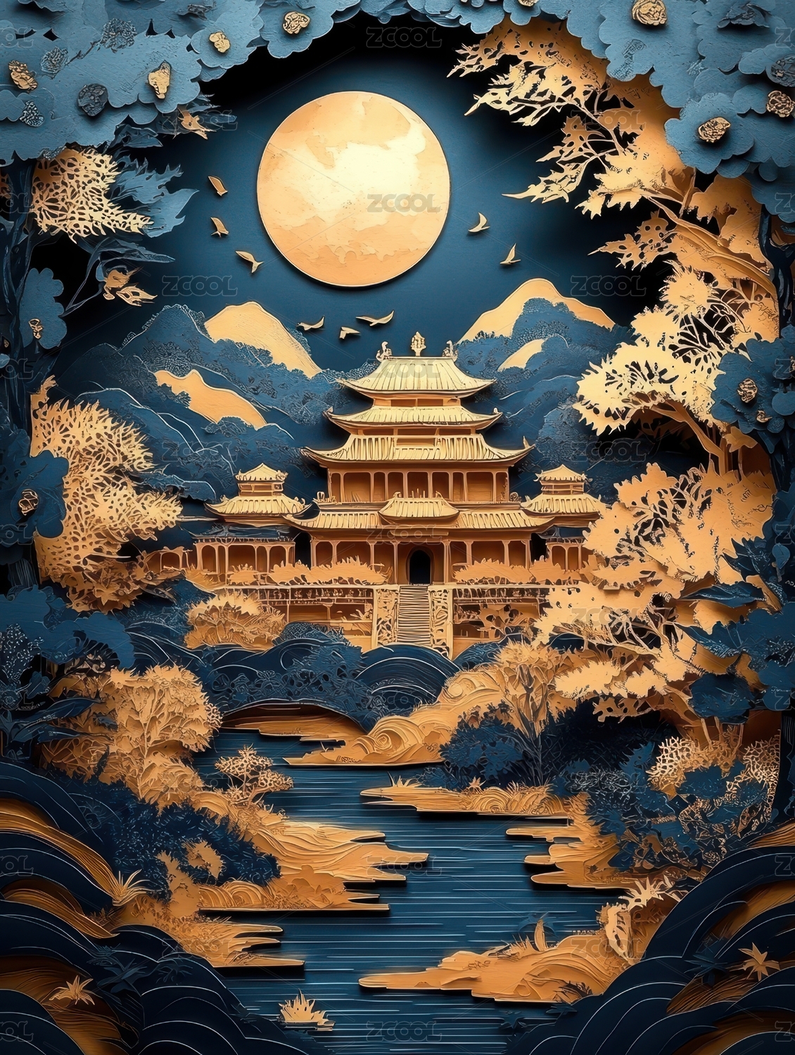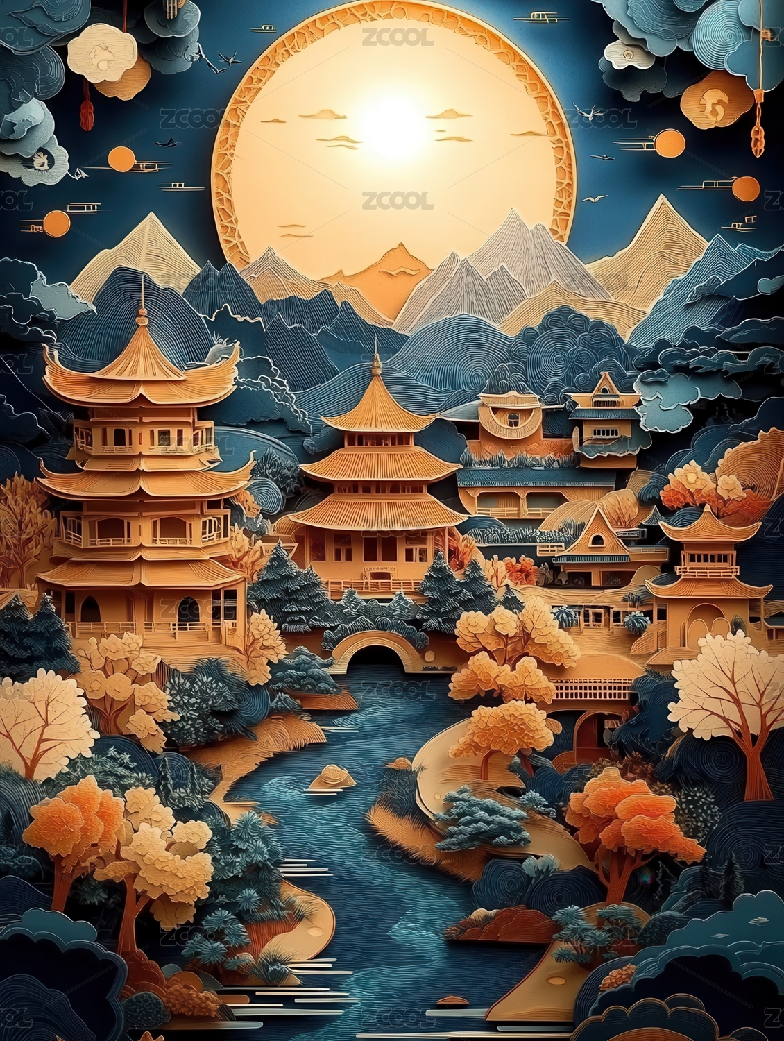 剪纸风格,中秋节,月圆山水风景,剪纸艺术,剪纸插画