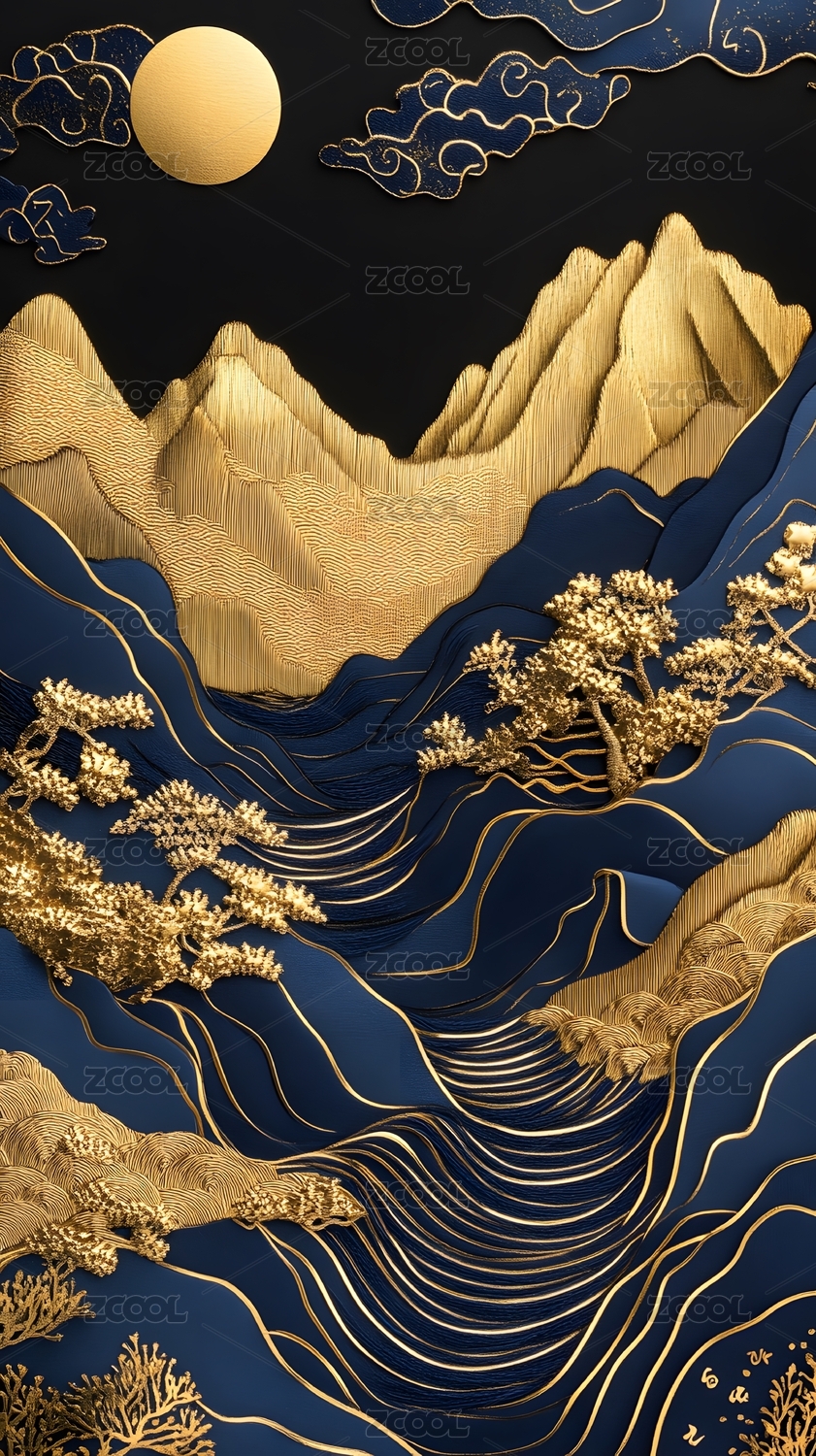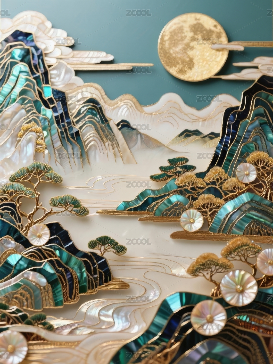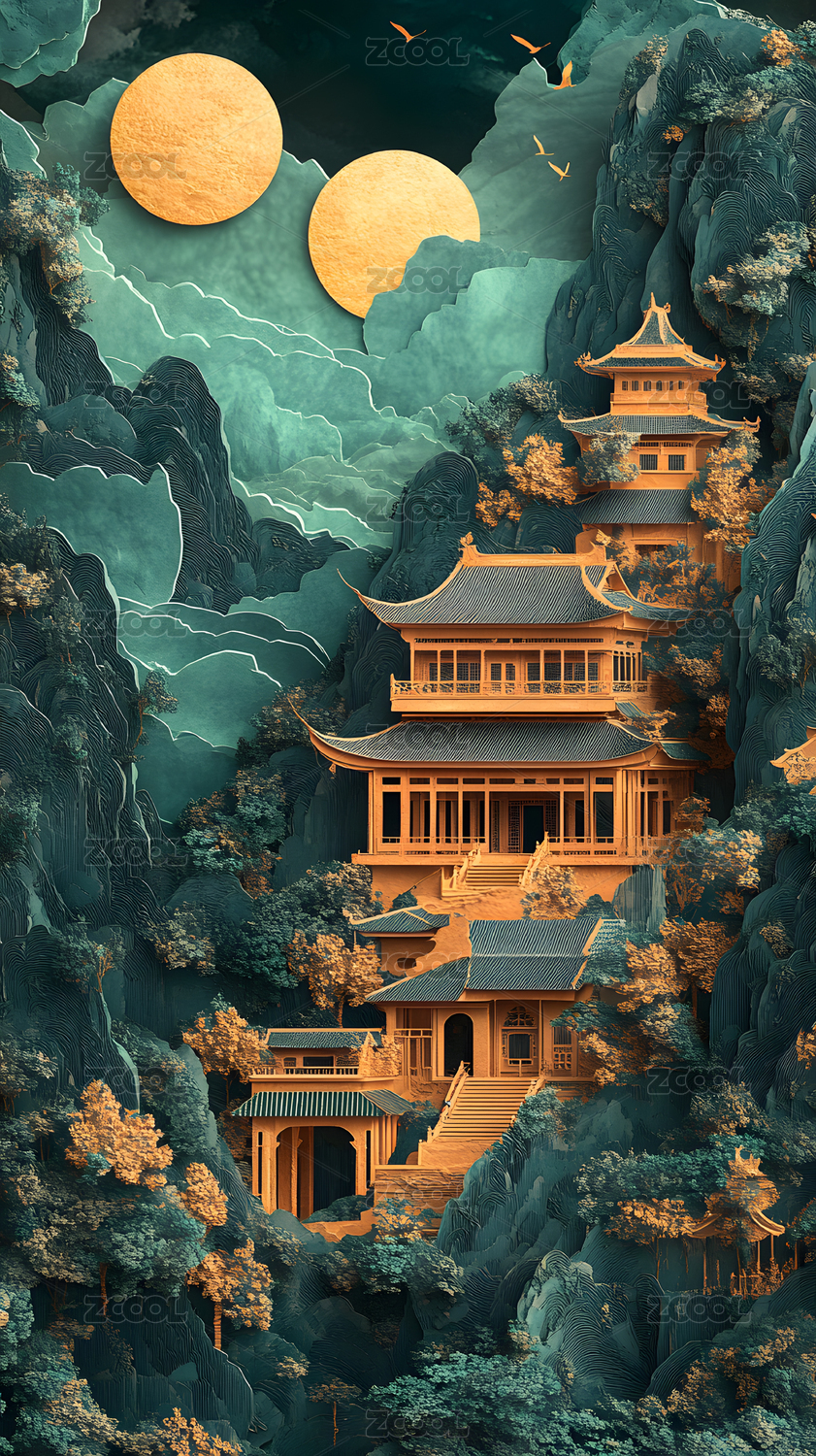 剪纸风格,中秋节,月圆山水风景,剪纸艺术,剪纸插画