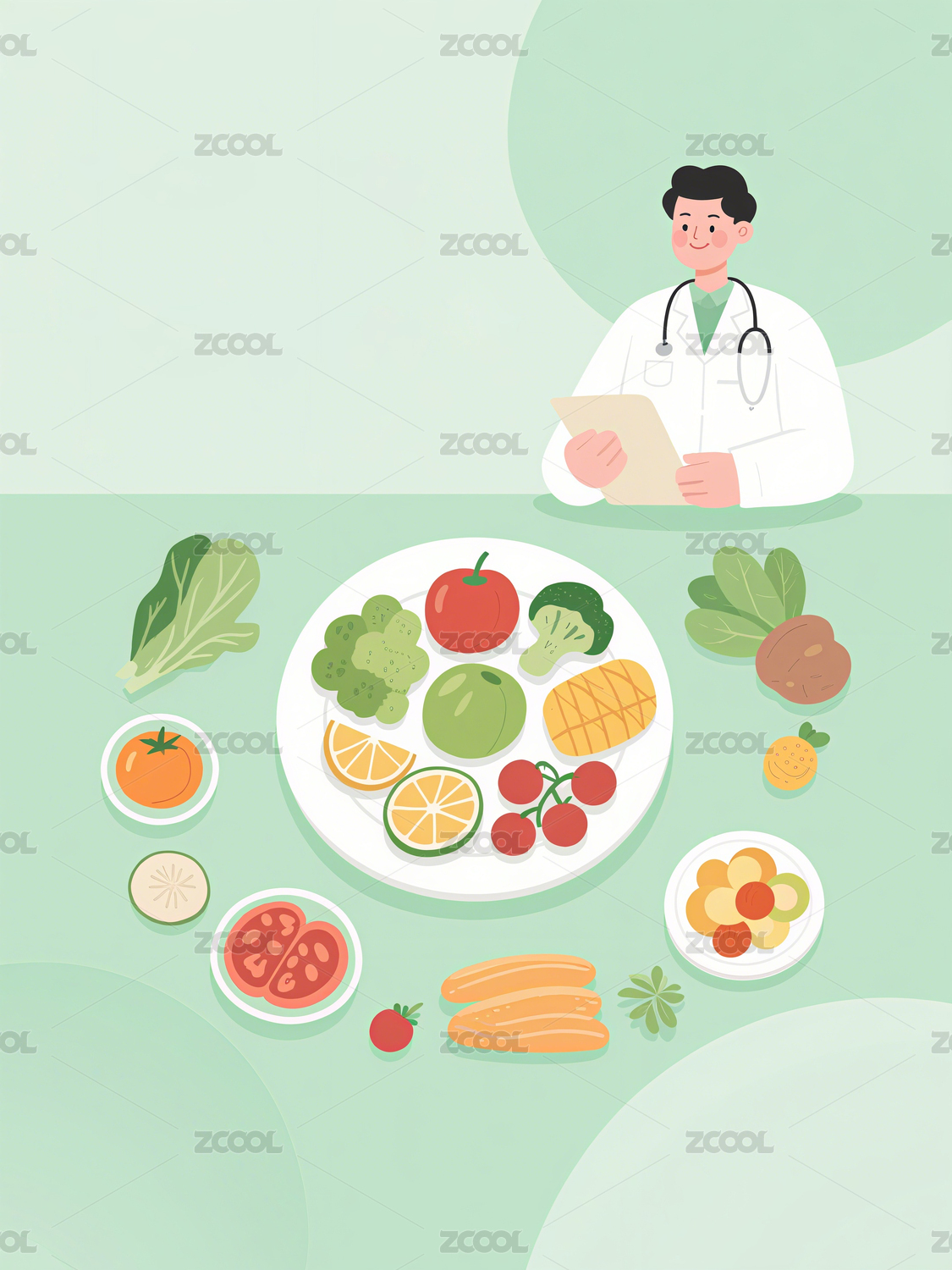 卡通风医疗营养搭配蔬菜营养师医生插画素材