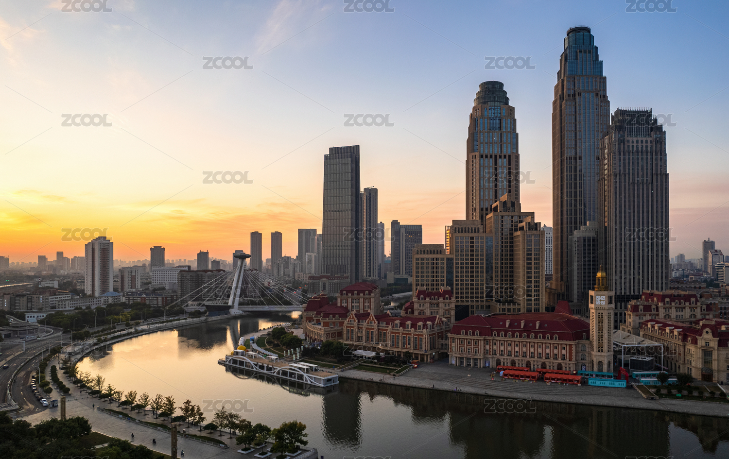 天津津湾广场金融中心海河城市建筑日落晚霞