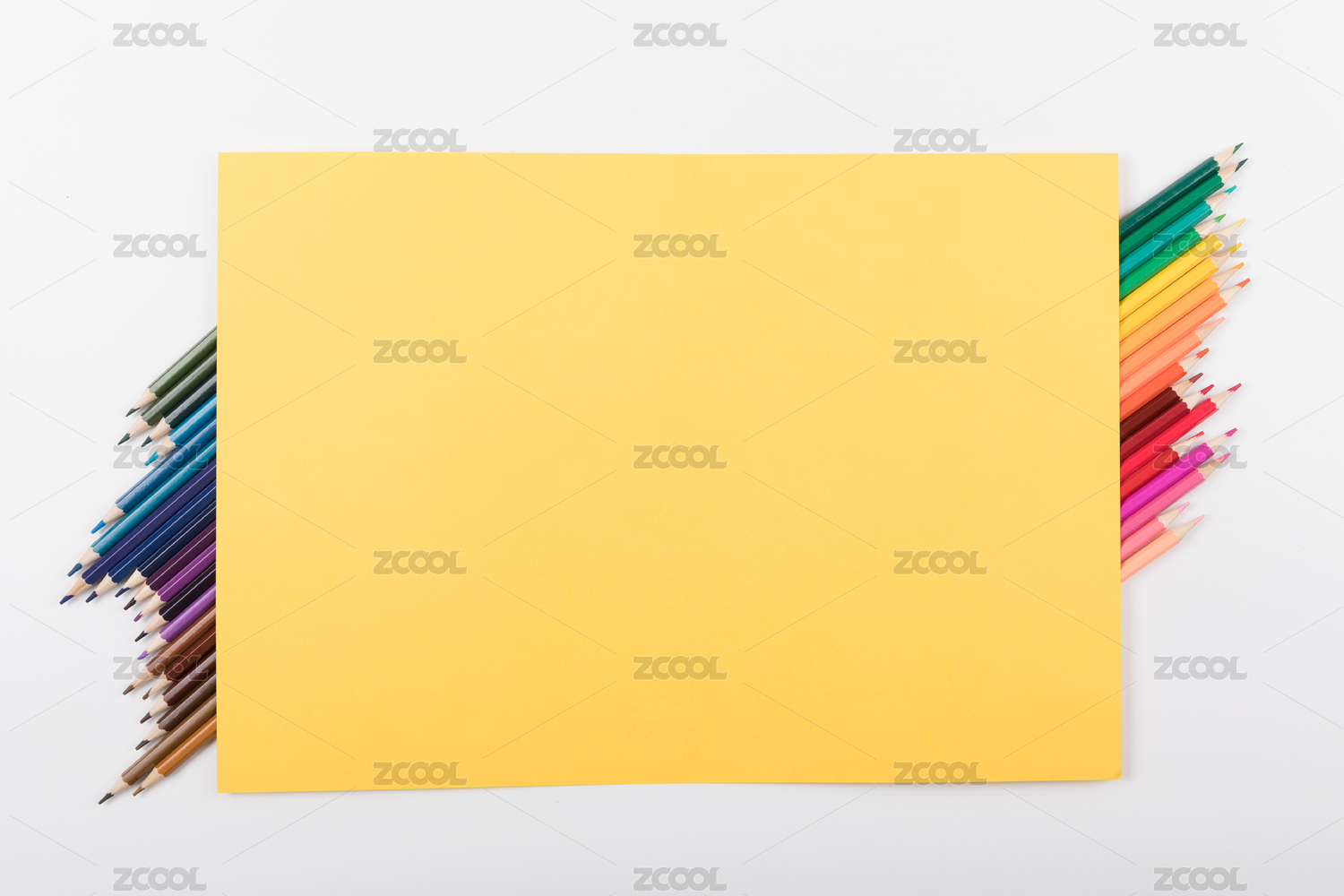 黄色画纸上放着一些彩色铅笔