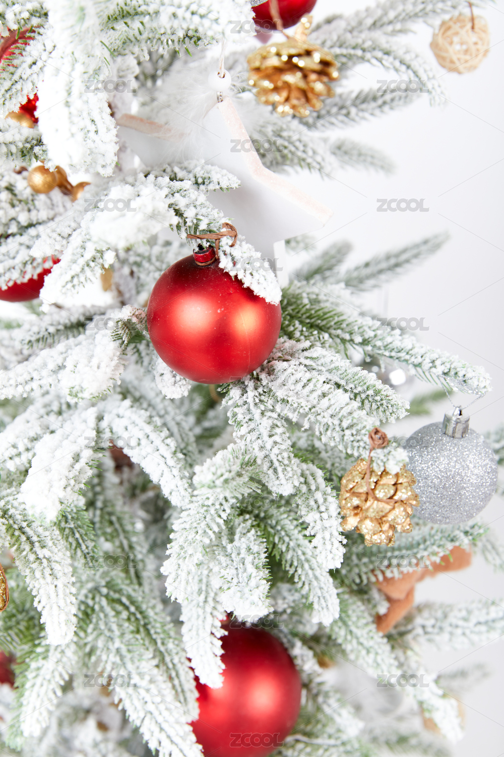 圣诞小装饰 红色果子 金色挂件 松树 雪