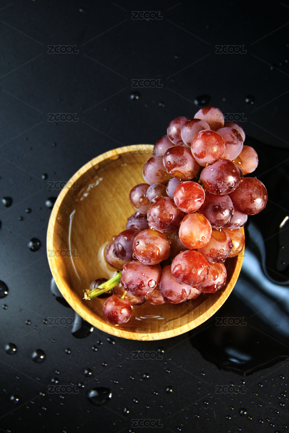 黑色背景下桌子上果盘装晶莹剔透的红色葡萄