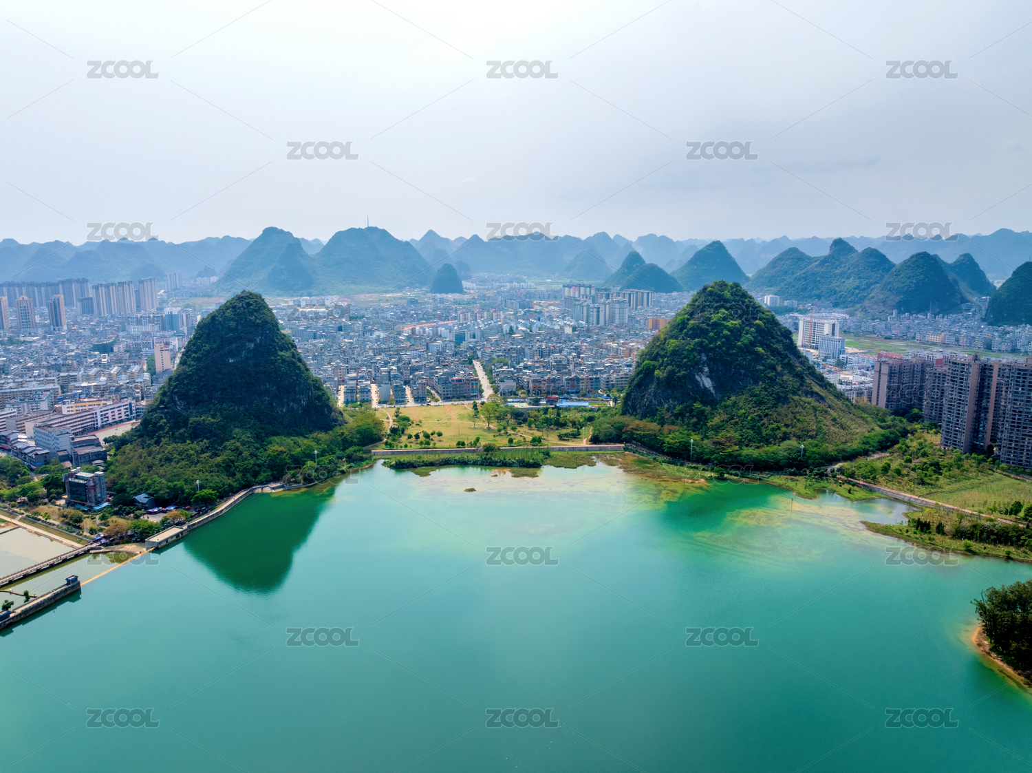 桂林漓江沿岸城市风景自然风光日落晚霞航拍