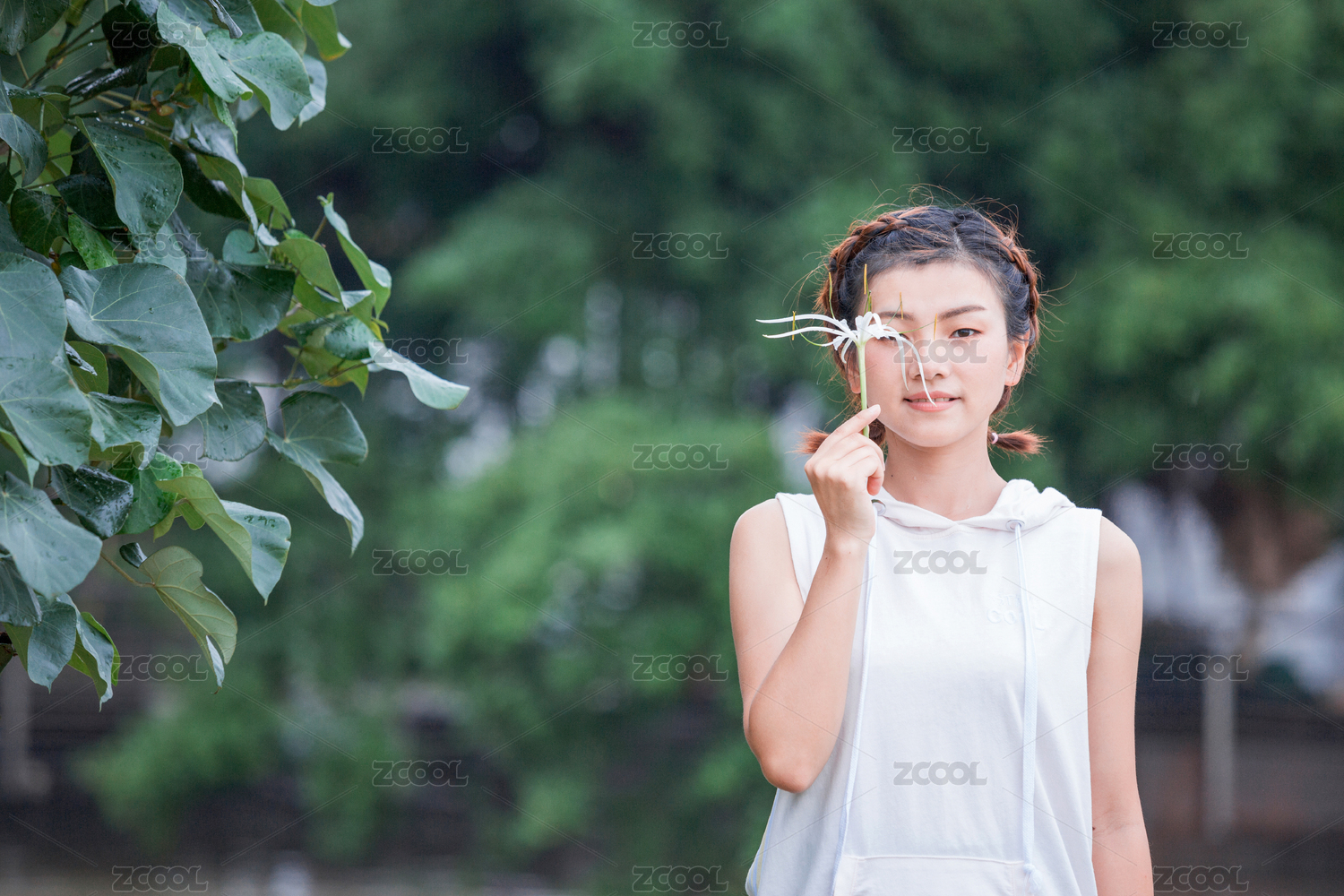女生站在树下拿着鲜花放在额头上